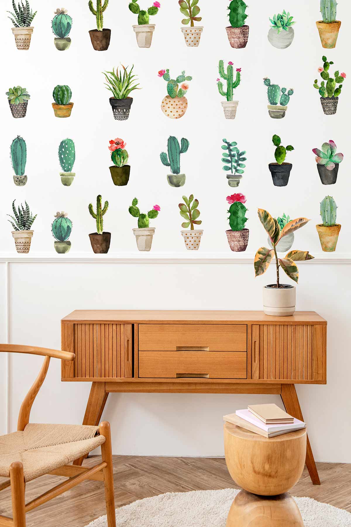 Boost energy into your place coming from the beauty of nature in greens. In this wallpaper mural of cactus flowerpot will make your home look lively and full of life and very relaxing. This mural wallpaper is a perfect match at your bedroom for more positive vibes with modern decorations. If you are opening your flower shop soon and you are looking for a very attractive style that attracts your clients impressed by the place and cannot resist your products. Style this mural at your kids鈥?room and enhancing their knowledge and give them information about these cactus types in the mural wallpaper.
