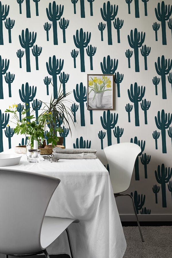 Immerse your space in the serene charm of nature with this sophisticated cactus pattern wallpaper mural. Featuring a repetitive motif of elegantly sketched cacti, the design captures the essence of desert landscapes, offering a tranquil yet stylish ambience. The use of deep teal against a soft cream backdrop brings a striking yet harmonious contrast, perfect for curating a modern and nature-inspired interior. Suitable for various spaces, this mural adds a touch of refined artistry, making it at home in sleek city lofts or cosy suburban retreats.