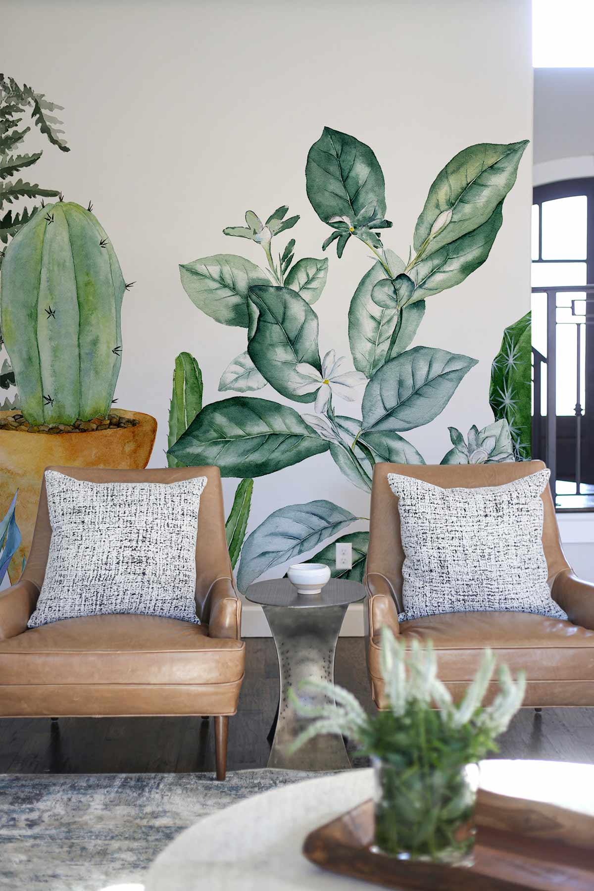 Immerse yourself in the serene beauty of our Cactus Plants Wallpaper Mural. Featuring meticulously painted succulents and leafy greenery, this design captures nature's grace with delicate detailing. The mural's soft, earthy tones and artistic brushwork evoke a calming atmosphere, perfectly suited to a variety of settings. Its lively yet peaceful composition brings the tranquil essence of a garden indoors.