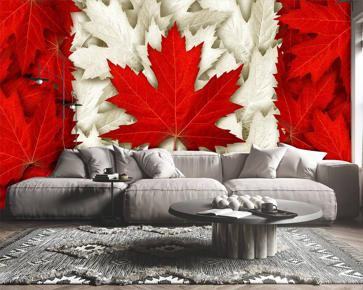 Embrace the timeless elegance of the Maple Leaf Flag Wallpaper Mural, featuring a striking interplay of bold crimson and subtle cream hues. This mural captures the iconic maple leaf, carefully layered to evoke a sense of depth and artistry. Ideal for adding a touch of sophistication to your space, its refined design balances heritage with a modern flair, creating a unique visual statement suitable for any discerning interior.