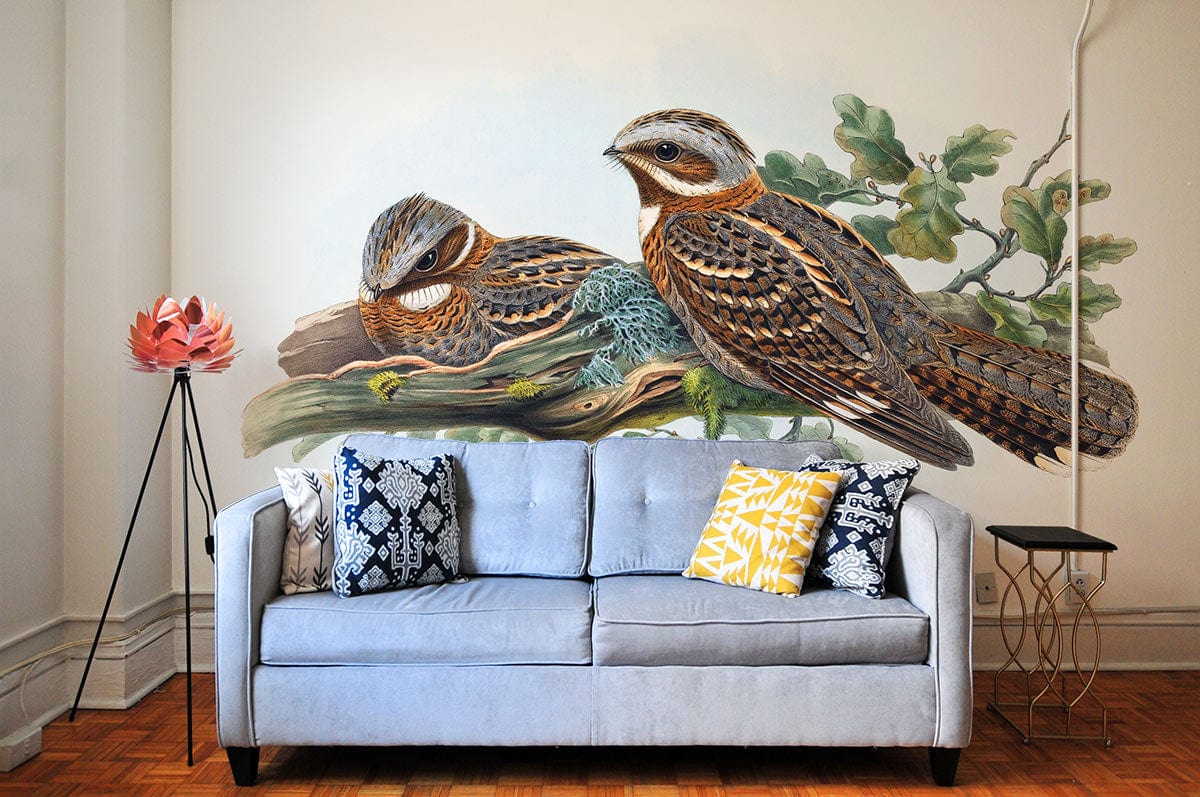 Immerse your space in the refined beauty of the Caprimulgus Ruficollis Wallpaper Mural, where meticulous artistry captures the serene presence of nightjars nestled in a natural setting. The delicate interplay of feathers and foliage creates an atmosphere of understated sophistication, perfect for complementing both classic and contemporary interiors.