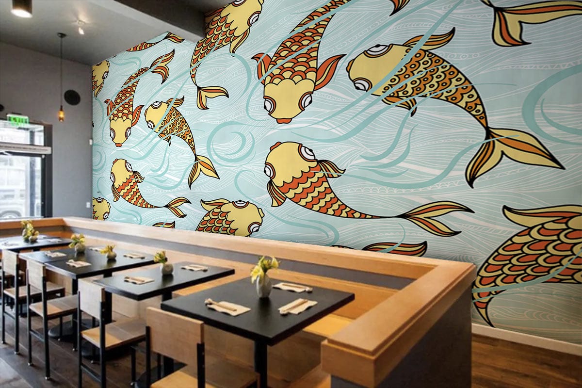 Immerse yourself in an aquatic masterpiece with the Carps In Pool Wallpaper Mural, where elegant koi swim amidst gentle, flowing patterns. This design infuses spaces with a serene and artistic ambience, making it an exquisite choice for any interior. The intricately detailed fish, with their golden scales and fluid lines, create a harmonious dance on a backdrop of tranquil aqua tones.