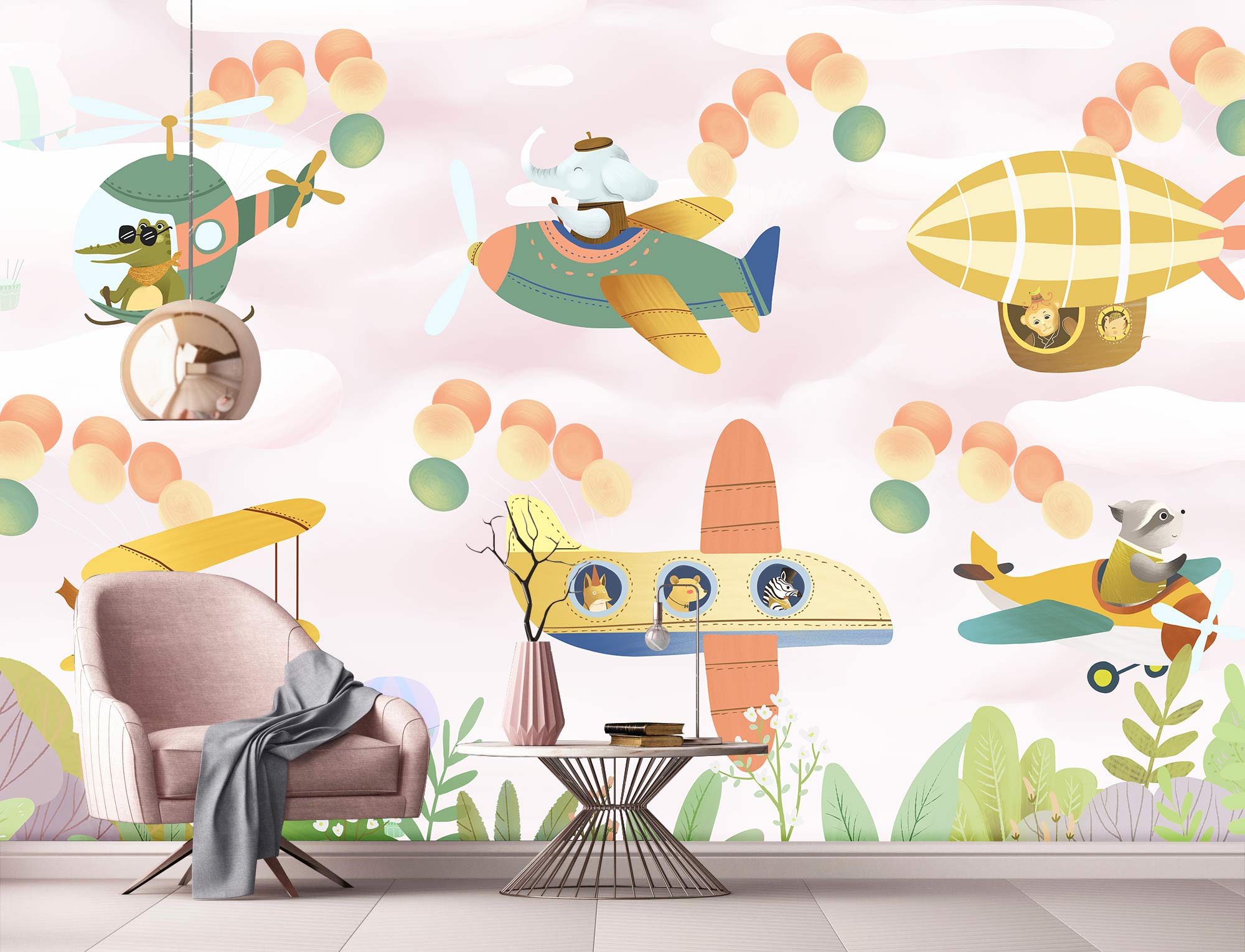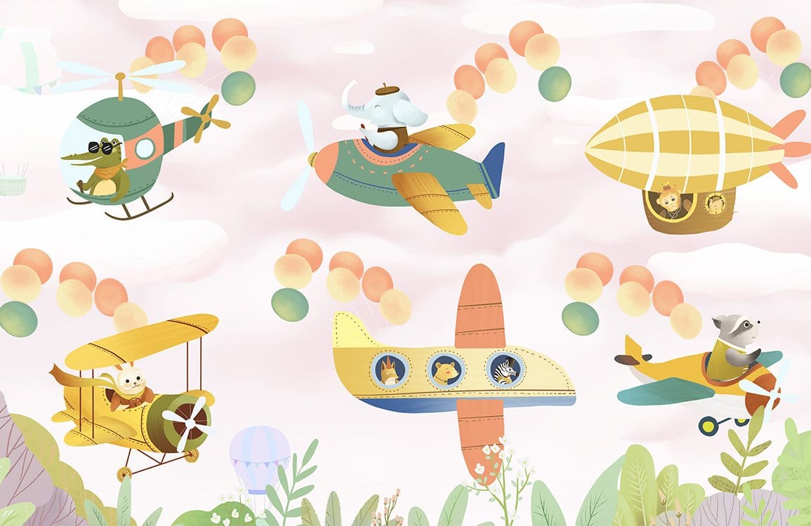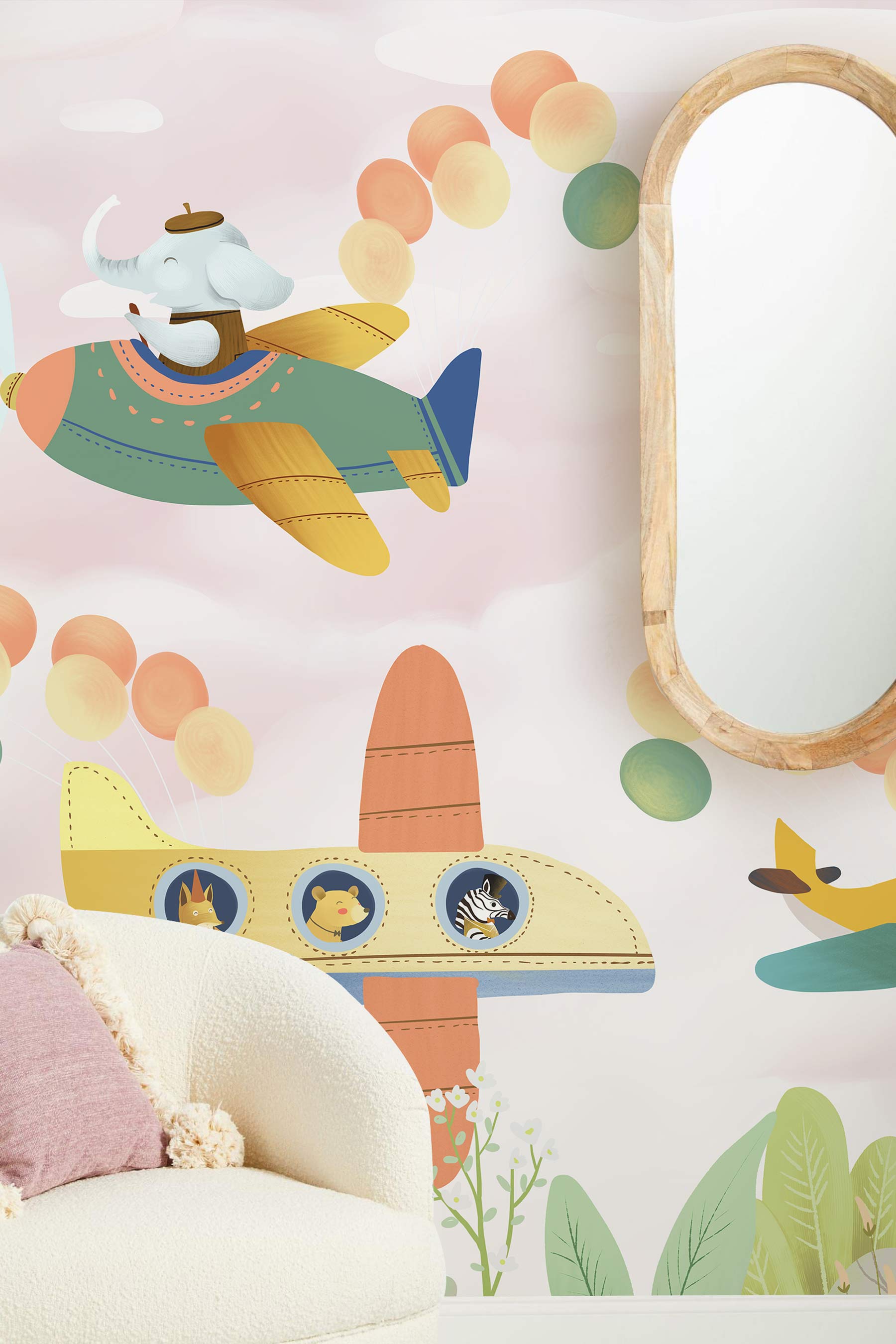 Experience the whimsical charm of the Pilots Wallpaper Mural, where playful vintage aircraft and adventurous animals soar amidst a backdrop of soft pink clouds. The intricate artwork and delicate textures create a lively atmosphere, perfectly balancing sophistication and nostalgia. This mural brings character and lightness, making it an ideal choice for diverse spaces.