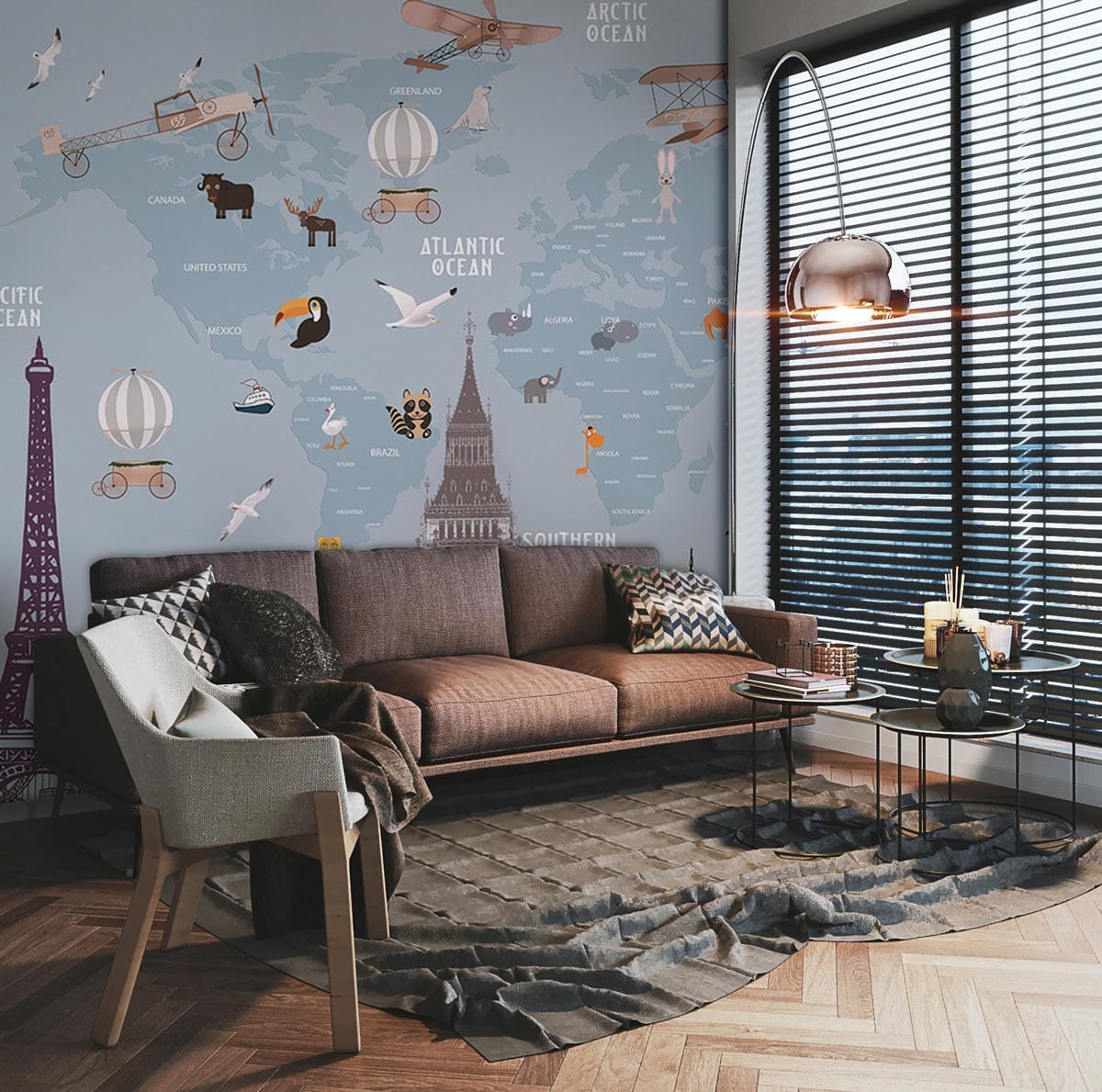 Plan your trip and adventure around the world for your kids with our world map wallpaper mural. This cartoon world map wallpaper introduces you countries throughout the world in a cute and funny way. The map draws the most representative animals in each countries that will help your kids learn the world in an really interesting and effective way. Ideal wall mural for nursery room and kid's room.