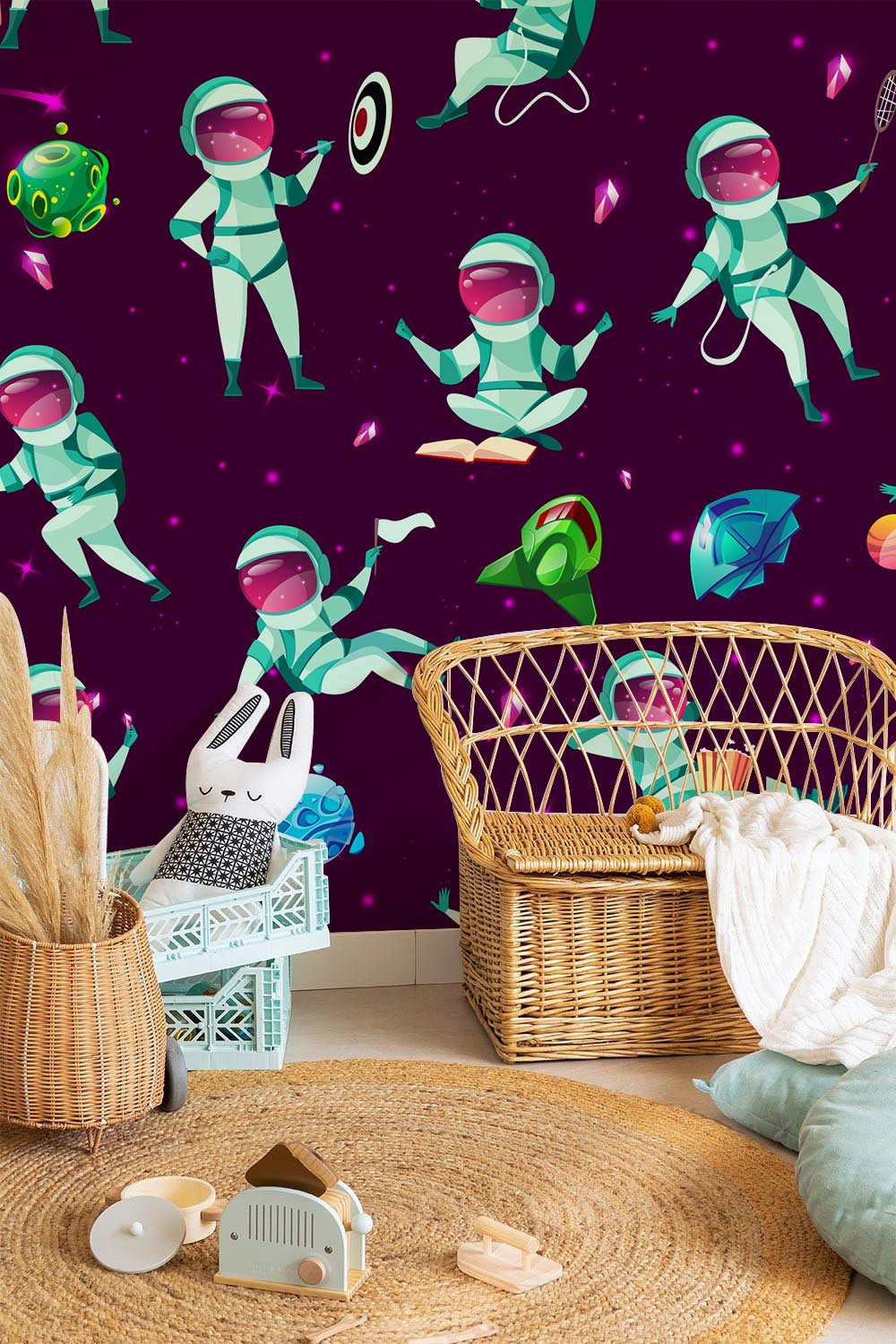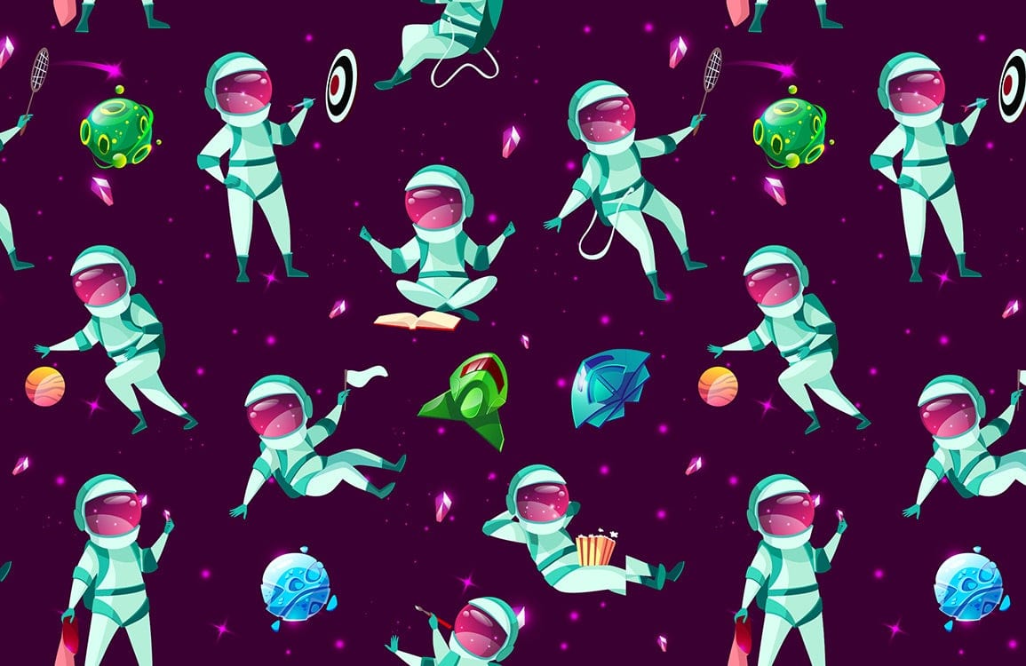 Give you kid a funny theme in his room with this cartoon astronaut wallpaper mural. If your kid is space dreamer and he love space ships and imagination, this wallpaper will be perfect for his character. The mixed purple with blue background and the playful astronaut characters are giving dynamicity. This mural wallpaper is going to fit your kids鈥?room, a nursery and playing kids鈥?area to give more fun vibes to the place. Don鈥檛 forget to tell us what you are looking for and our talented team will help you set the whole place up with what you dream of.