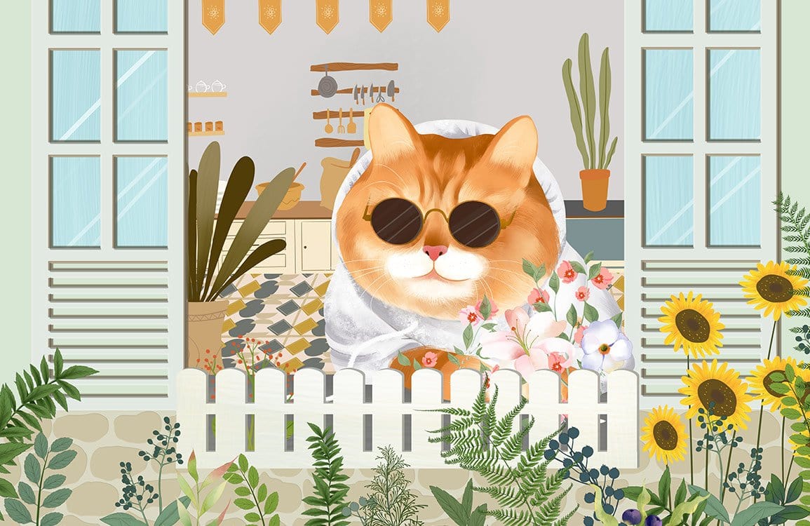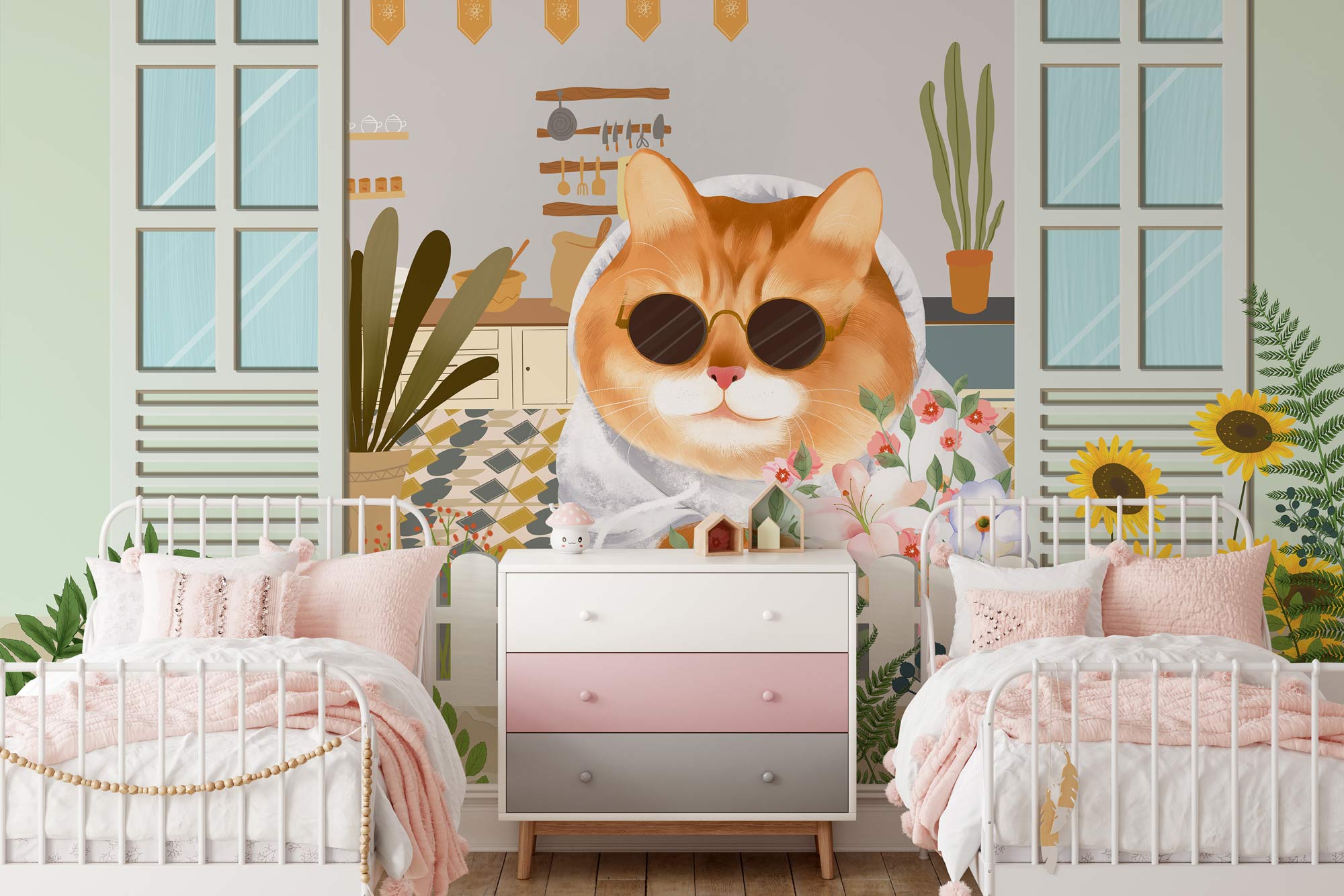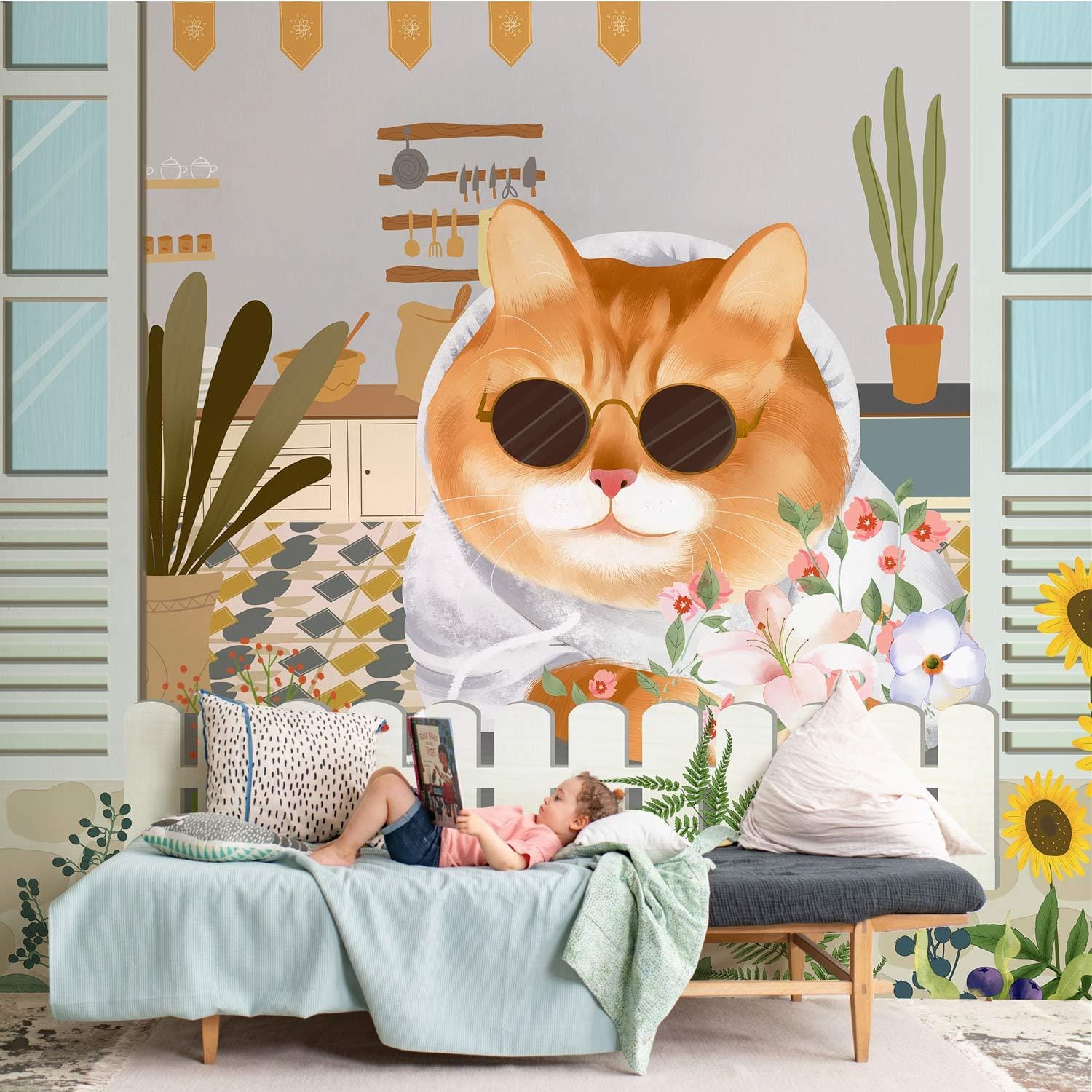 Take a look at this cute cartoon cat wallpaper mural. Featuring a big cat with sunglasses enjoying a sunny afternoon. Painted with colouful colours that will be perfect for your child隆炉s bedroom or playroom. Place this adorable cat wallpaper on the wall that is next to their bed and enjoy the colourful and lively feeling it brings to you.
