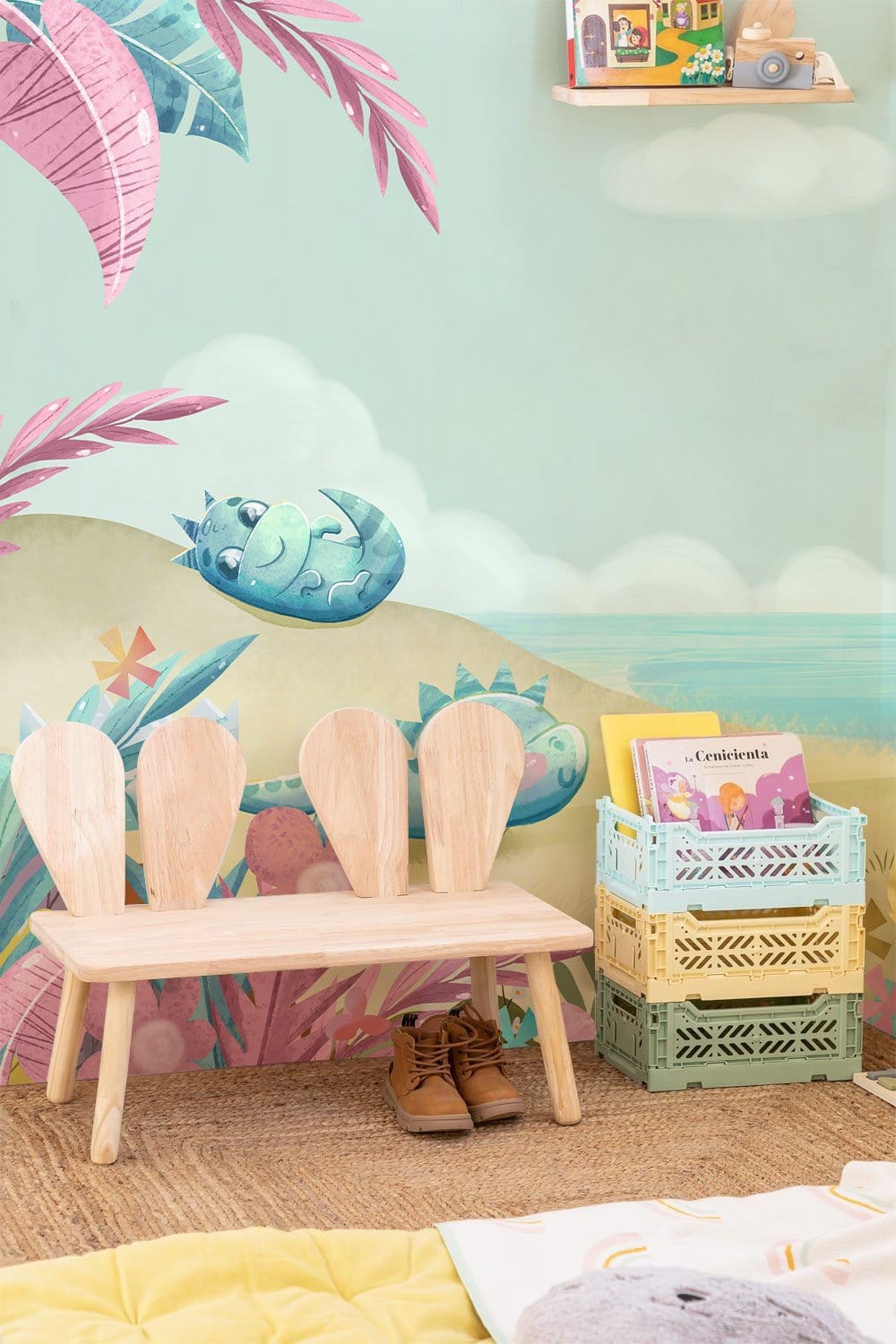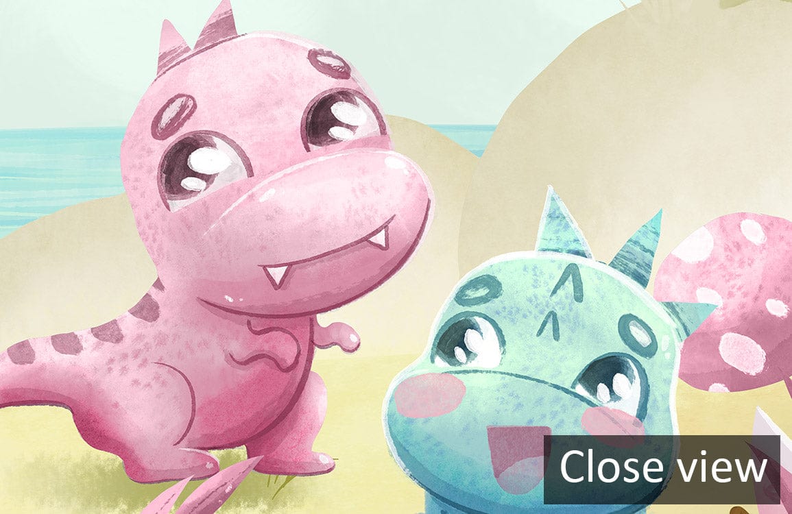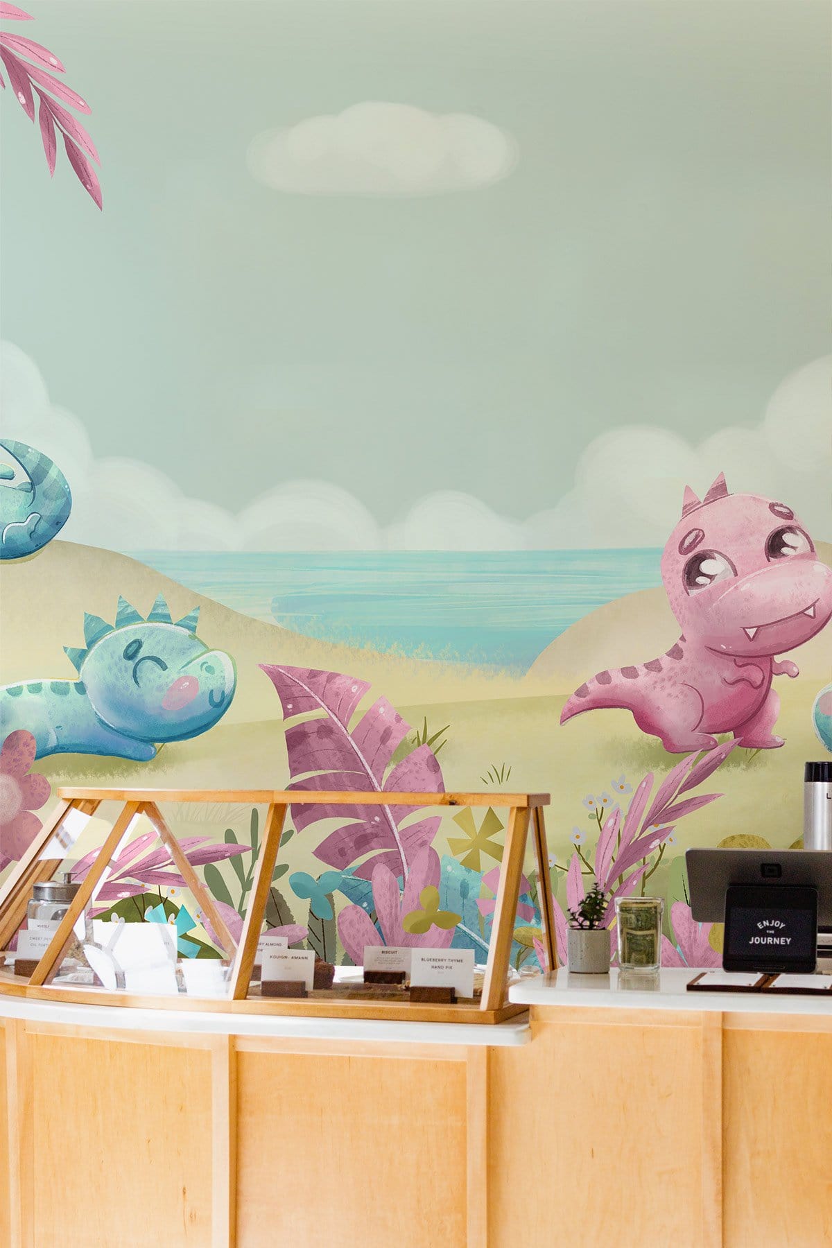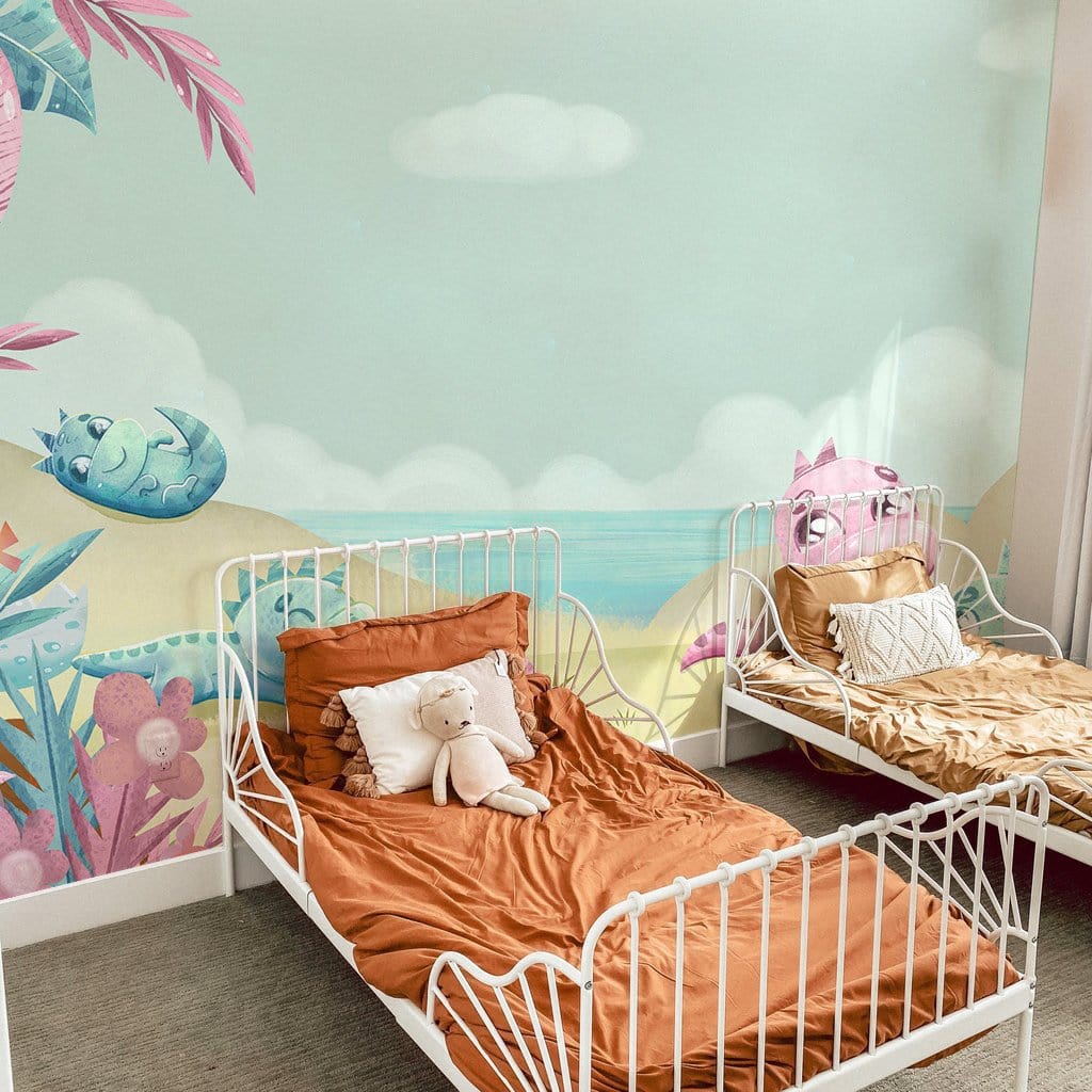 Immerse yourself in a whimsical landscape where playful dinosaurs frolic amidst pastel-hued flora. This mural brings a serene yet vibrant atmosphere, perfect for adding charm and character to your space.