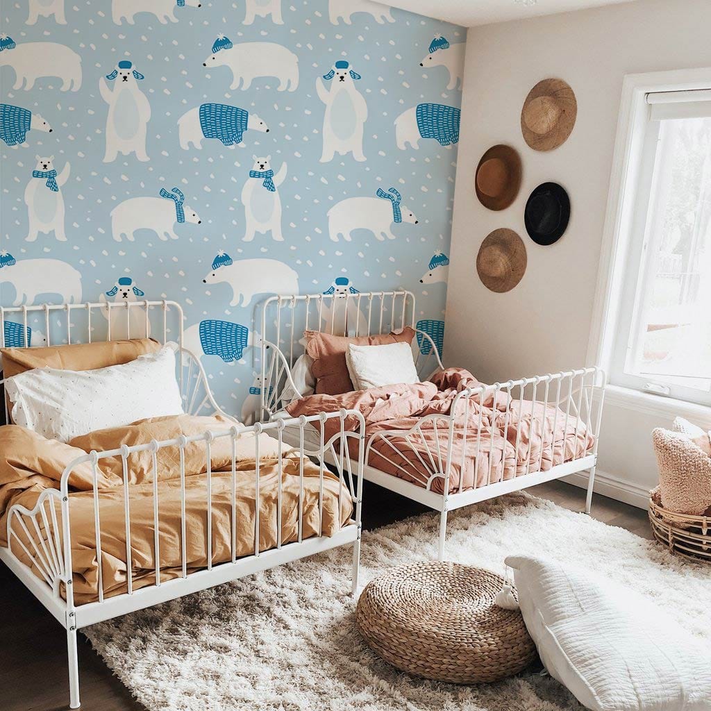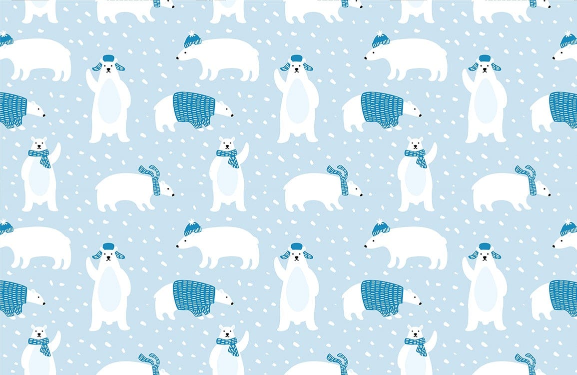 Feel the winter vibes with Mr. polar bear, one of our mural cute wallpaper designs that will make your place full of winter vibes and charismatic spirit too. It is one of these murals that you can use it all the year or if you want to renovate your place it is perfect for the winter season for decorating your living room, your children play area, or your kids鈥?room for more fun and more lovely pictures. The design is simple full of bears pattern that is so simple and matches both kids and adults. Try to use a dark colour in the decorations so dark grey or navy blue will be so good for the contrast of the place. But if you want the place to be full of life and even brighter use off-white for the furniture and decorations and let the place breath.