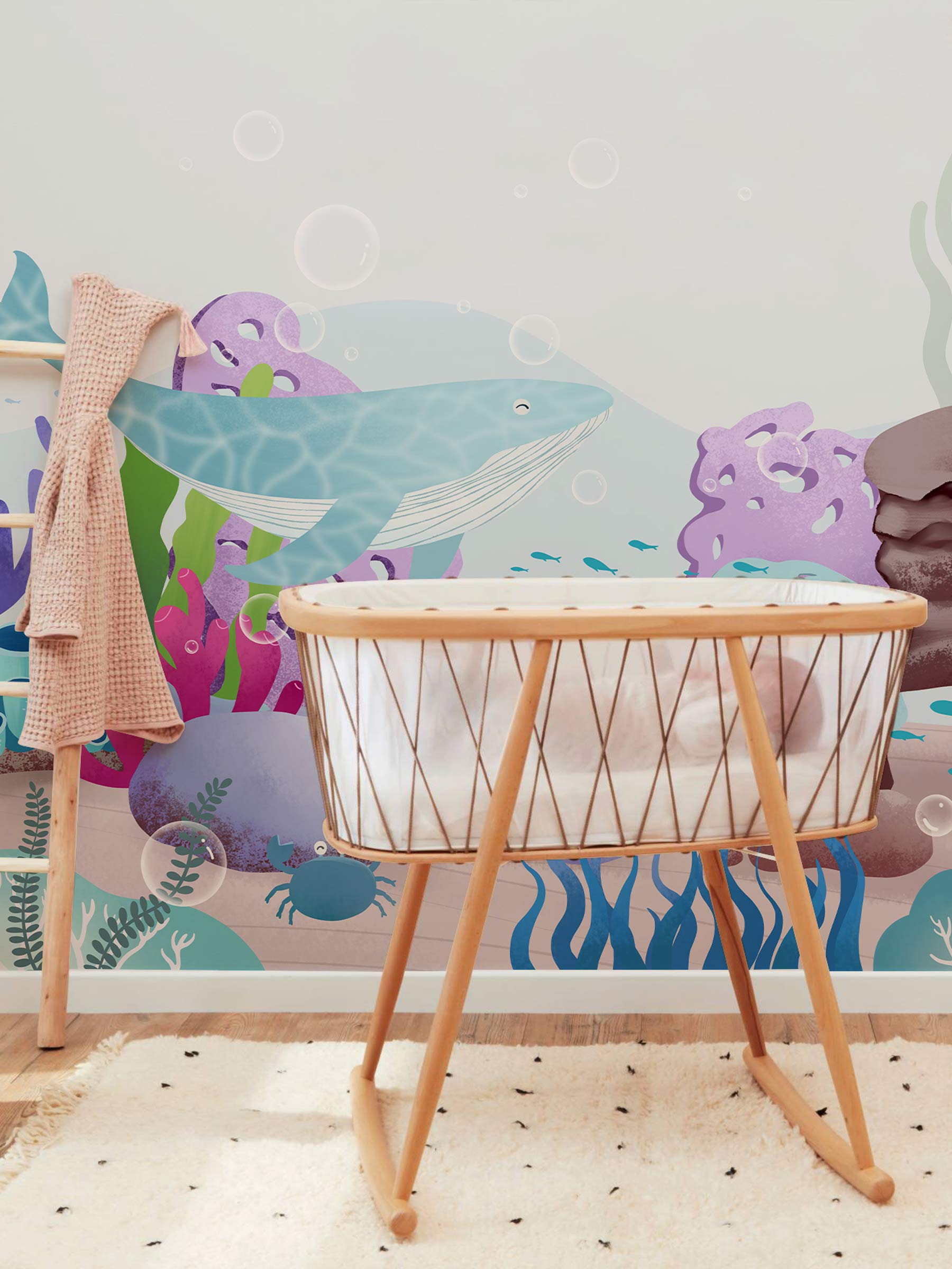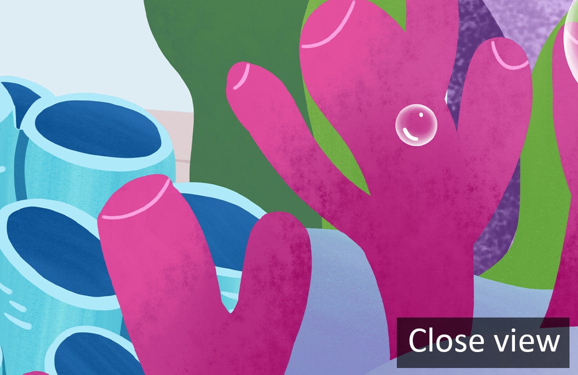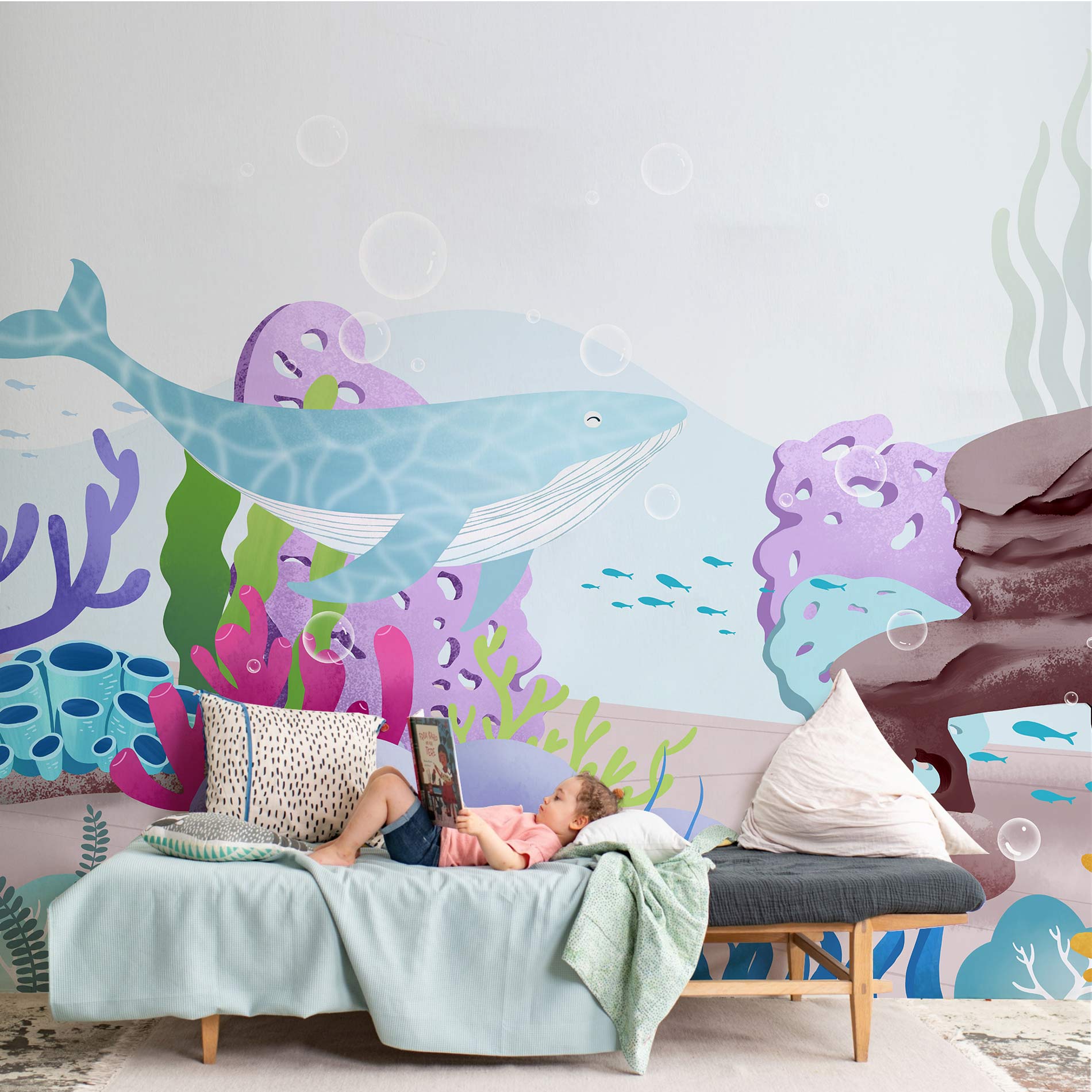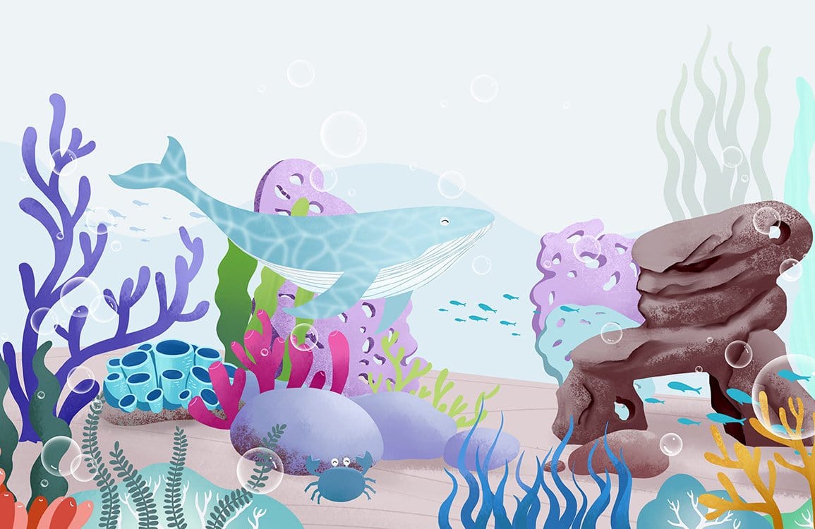 Explore the amazing world under the sea with this wallpaper mural. Your kids are going to love it! This wallpaper mural featuring a beautiful scene of hand-drawn sea animal creatures such as blue whales and colourful corals, will surely revamp your space! Great wallpaper for kids bedroom and playroom.