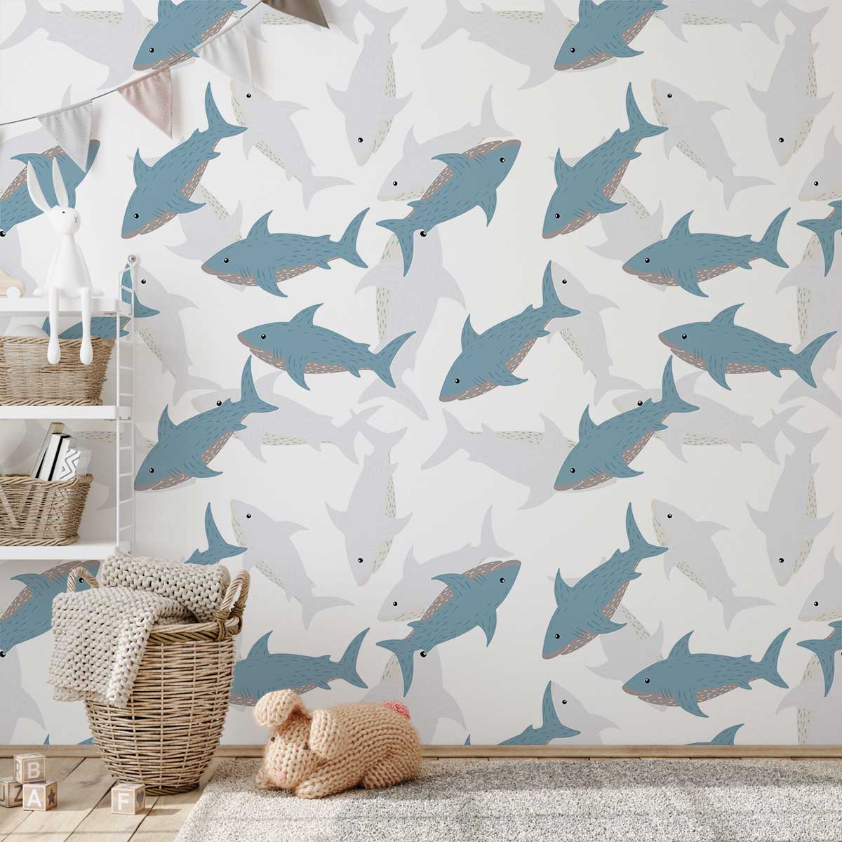 Baby shark? isn鈥檛 it our favorite! No matter how old are you, you will sing the song by default once you see our baby shark mural wallpaper that is so nice and lite for kid鈥檚 room decorations. The design is so lite and the palette of the colours is pastel and bright that make the place so vibrant and modern. It also gives the felling that the place looks wider because of the light colours, the shades of blue and white are a perfect match for a calm looking area and a simple one also in choosing the decorations. You can use navy blue curtains and carpets to give a perfect contract with the shark design and you place will look so elegant.