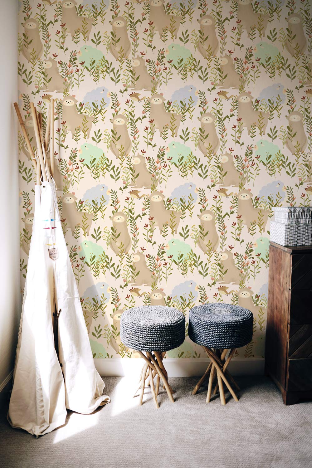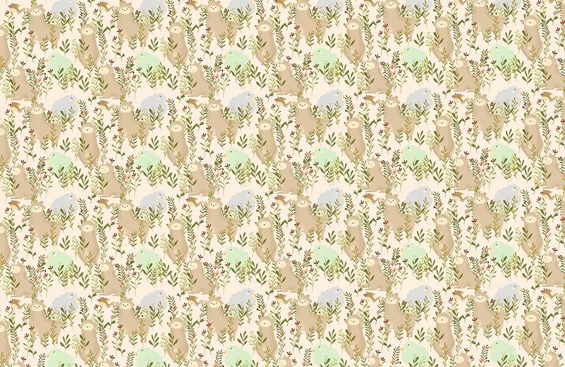 Immerse your space in pastoral charm with the Sheep Wallpaper Mural, featuring delicate illustrations of sheep amidst verdant flora. The muted tones and intricate patterns offer a serene ambience, ideal for a variety of sophisticated settings.