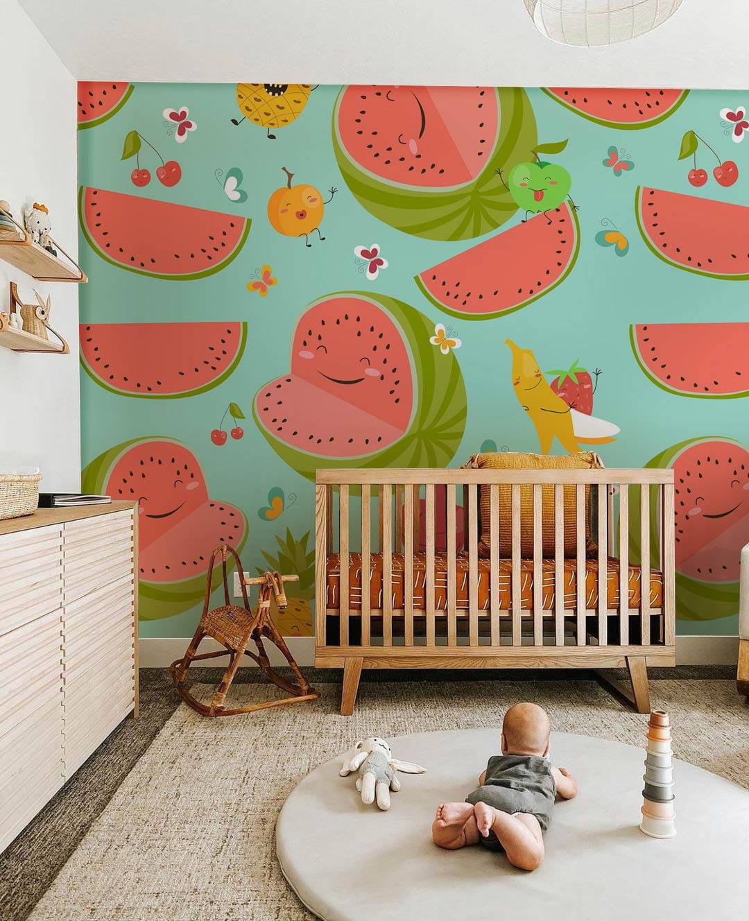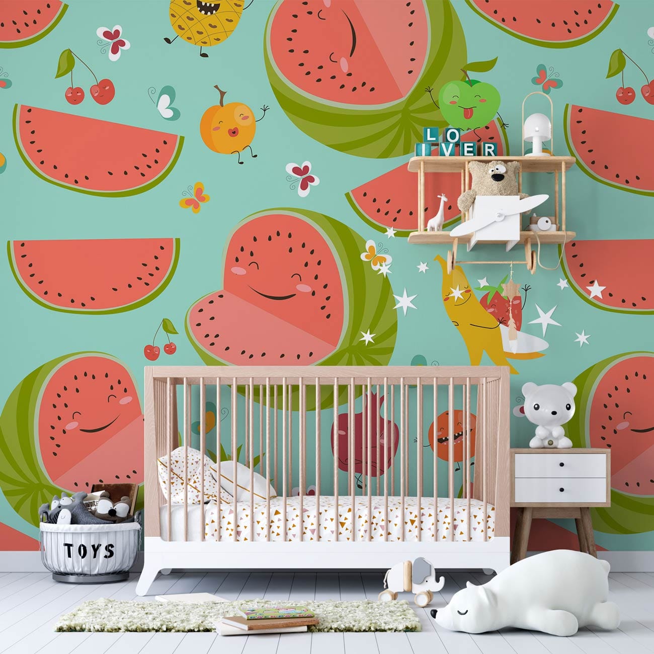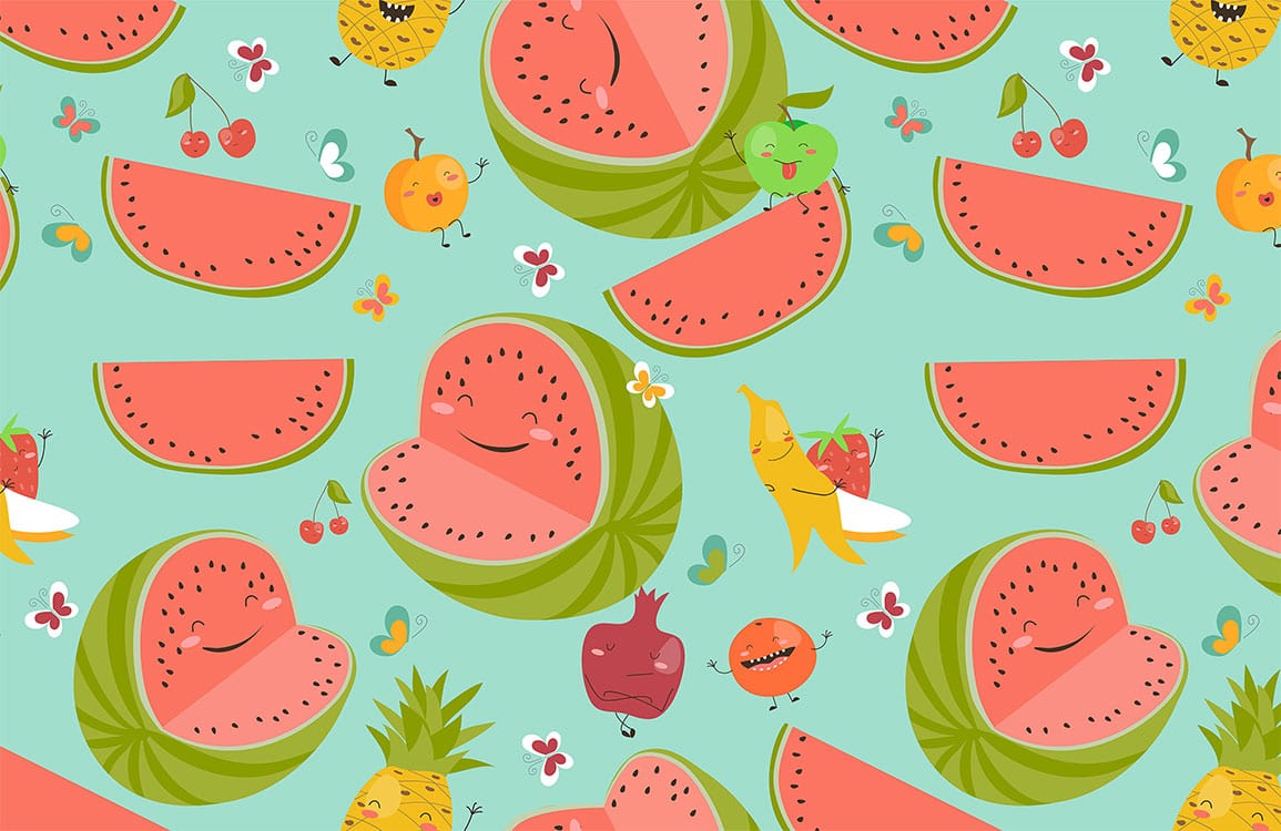 Immerse your space in a whimsical yet refined charm with this Cartoon Watermelons Wallpaper Mural. Featuring playful illustrations of watermelons interspersed with cheerful fruits, the design pops against a soothing mint backdrop. The artistic detailing offers a joyful ambience, making it versatile for various settings while retaining a touch of sophistication.