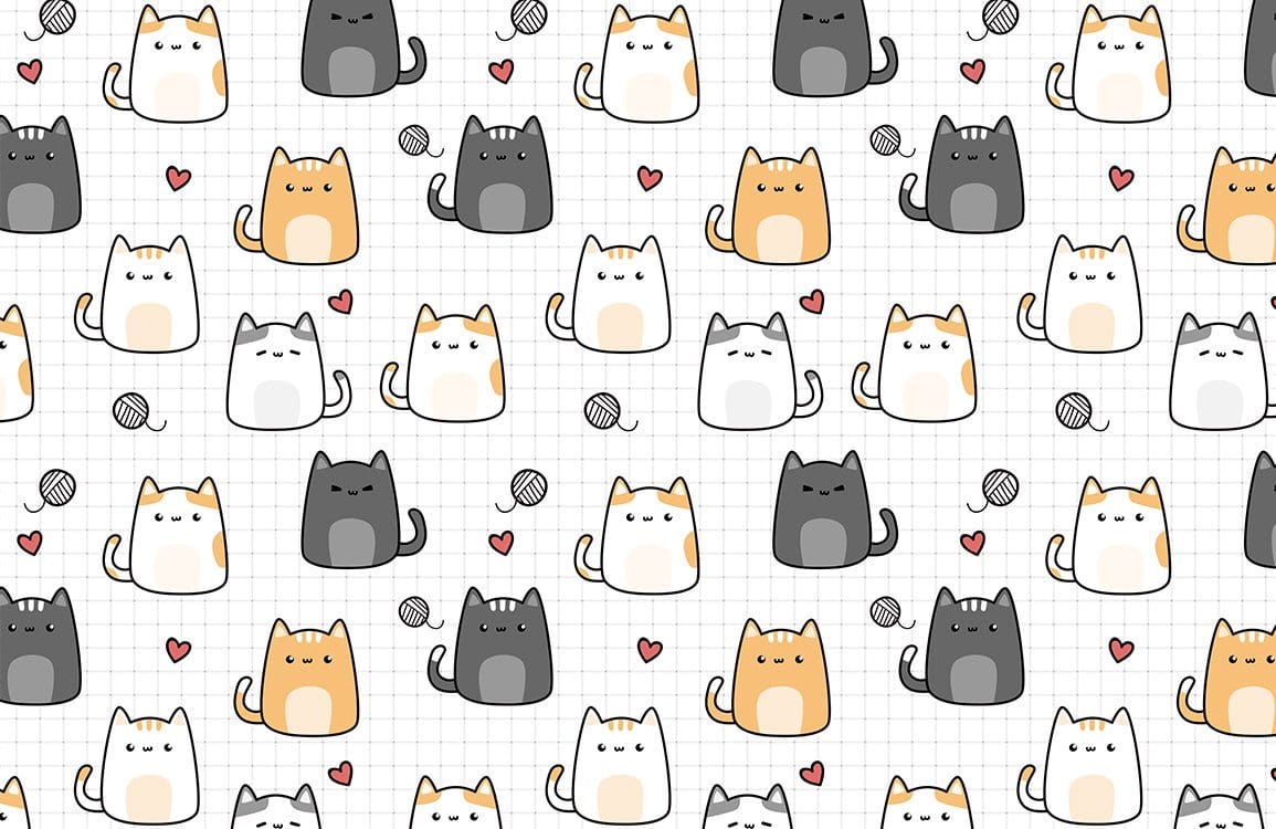 This charming Cat Lovers Wallpaper Mural brings a whimsical touch to interiors with its array of playful feline illustrations. Set against a subtle grid background, the cats are depicted in delightful poses, accompanied by tiny red hearts and soft yarn balls. The artwork's soft tones create a soothing atmosphere that infuses a sense of calm, making it a perfect fit for cozy, inviting rooms.