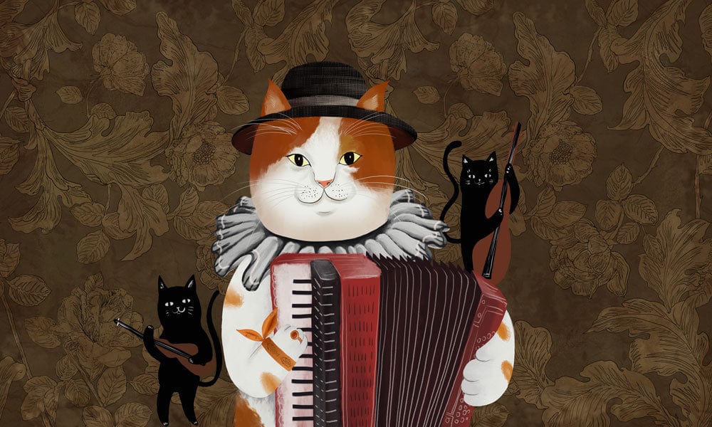 Introduce a touch of whimsy and depth to your interior with the Cat Performer Wallpaper Mural. Featuring an exquisitely detailed feline musician adorned in vintage attire and accompanied by playful black cats, this mural captures an artistic charm. The rich backdrop of floral patterns adds a layer of elegance, making it a fitting choice for both classic and eclectic spaces.