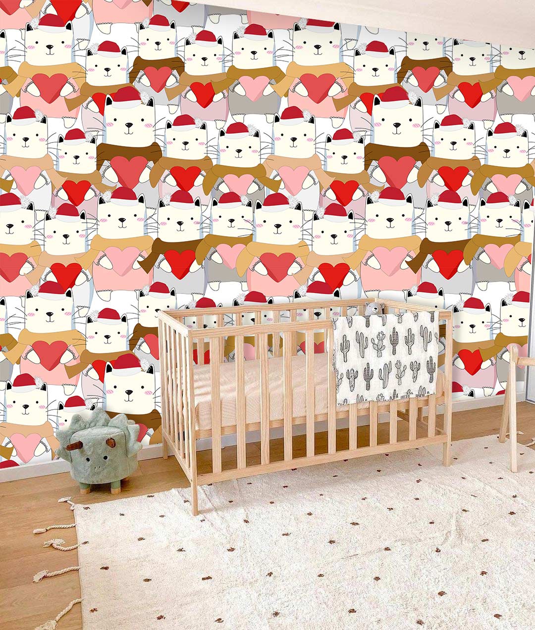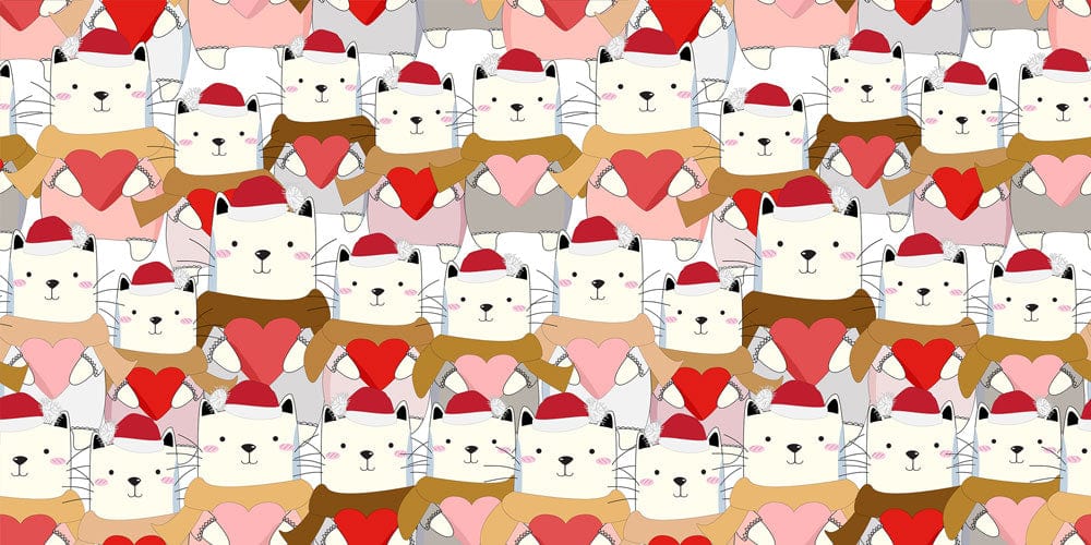 Introducing the Cats with Love Wallpaper Mural, a charming blend of whimsical artistry and heartfelt design. Adorned with delightful felines cradling vivid hearts, this pattern comes to life through a balanced palette that brings warmth and charisma into any space. Its playful yet sophisticated imagery creates a dynamic backdrop, seamlessly fitting diverse interiors, from the contemporary to the eclectic.