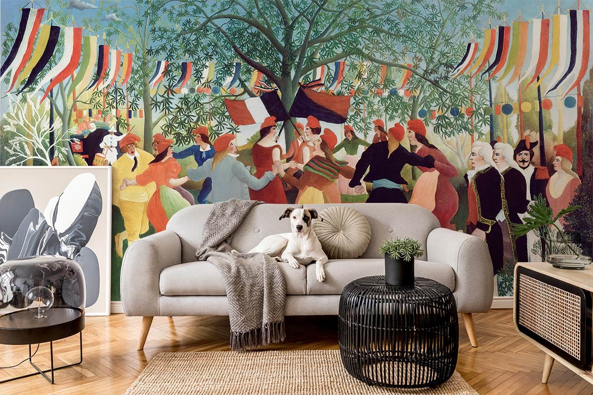 The Centennial of Independence Wallpaper Mural captures a vibrant celebration, featuring a lively dance scene set against a backdrop of lush greenery and striking tricolour banners. Its rich colours and intricate details lend a sophisticated historical narrative to any space, evoking the timeless joy of community gatherings. This mural's dynamic composition and elegant artistry make it the focal point of any interior, perfect for those wishing to infuse a sense of culture and festivity into their decor.