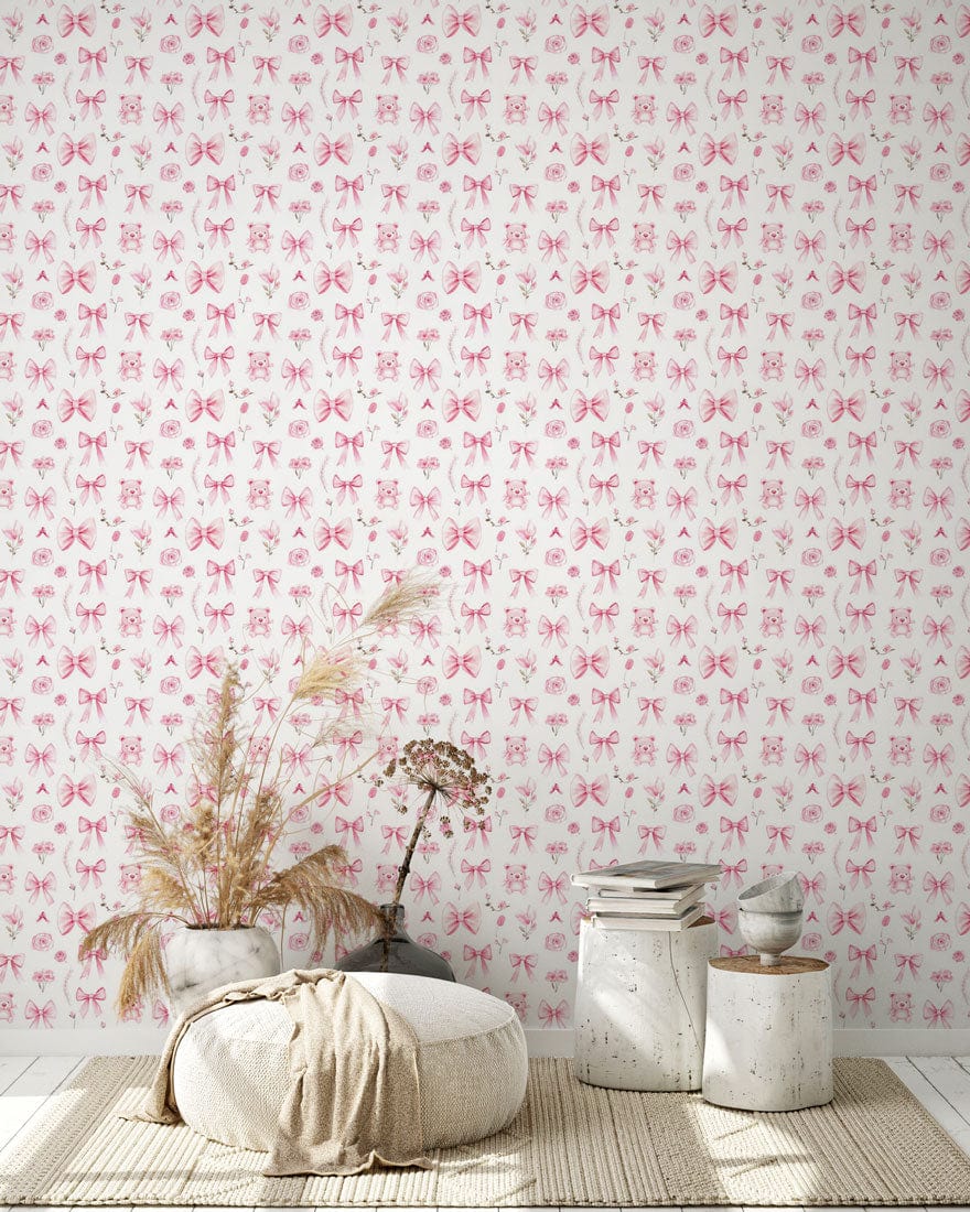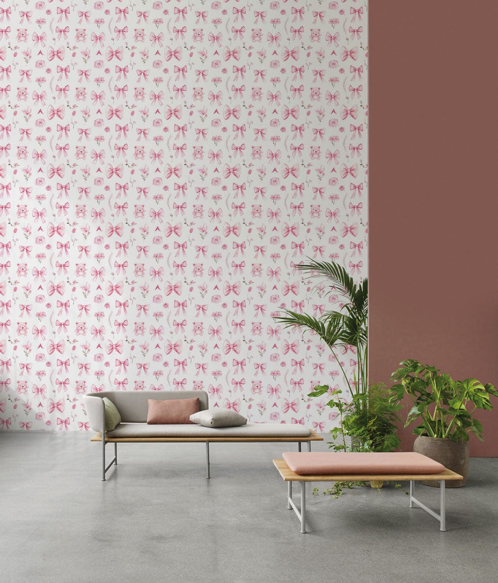 The Charming Bows and Blooms Mural Wallpaper captivates with its delicate intertwining bows and floral motifs, offering a subtle yet sophisticated touch to any space. This design combines intricate patterns with muted hues, making it a timeless choice for those seeking elegance. Perfectly suited for a variety of interiors, its artistic texture provides both character and a sense of serenity.