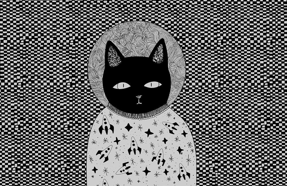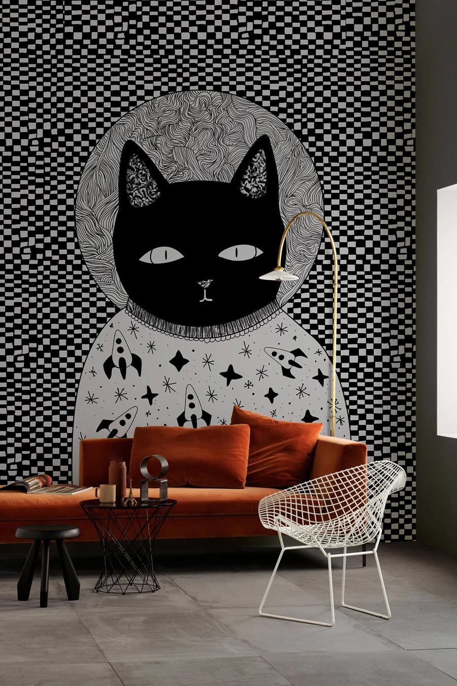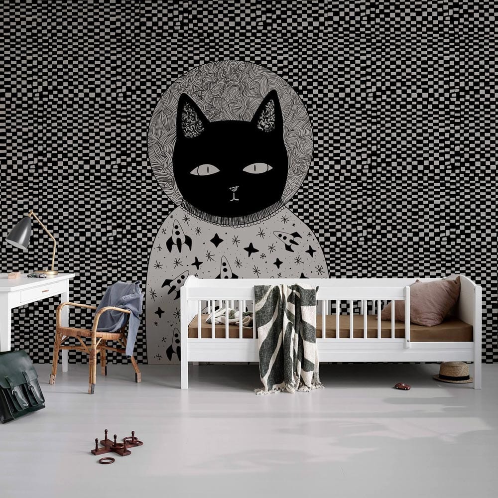 Introducing a captivating mural that blends whimsical artistry with classic design. The Checkerboard Cat Wallpaper Mural features a striking black and white pattern with a celestial-themed feline at its centre. This intricate design offers a playful yet sophisticated ambience, making it an exquisite choice for diverse interiors.