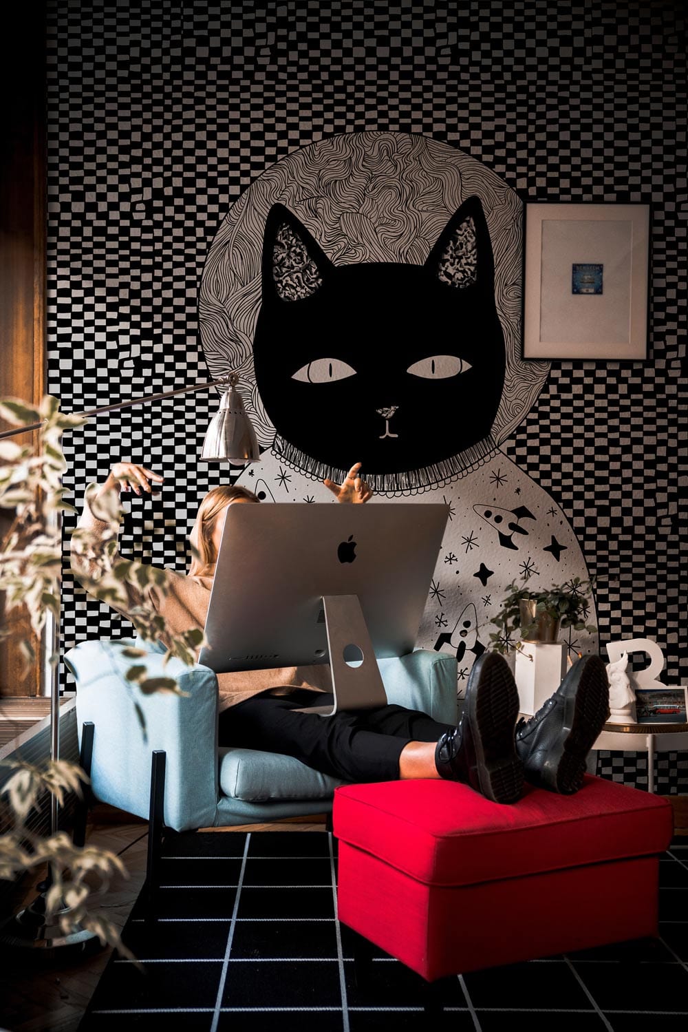 Decorating with wallpaper murals is not just for kids anymore. The Checkerboard Cat Wallpaper Mural is a great way to add character and colour to a dull wall or to create a focal point in any room of the house. This is a whimsical wallpaper mural that brings your favorite feline to life through a checkerboard illustration. The wallpaper features a cartoon-styled monochrome cat with a black and white checkerboard background and long ears. This cat can be the perfect piece of art for any child鈥檚 room or nursery wall with its playful design, fun colours, and hipster vibe.