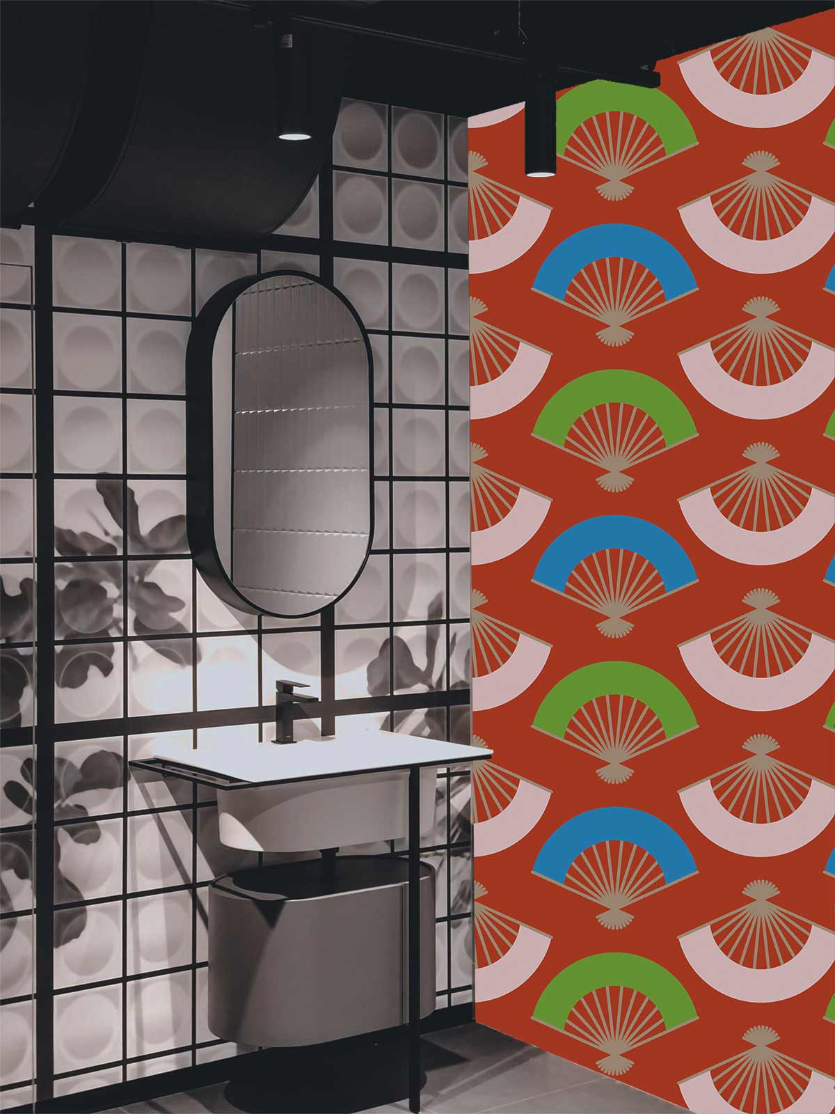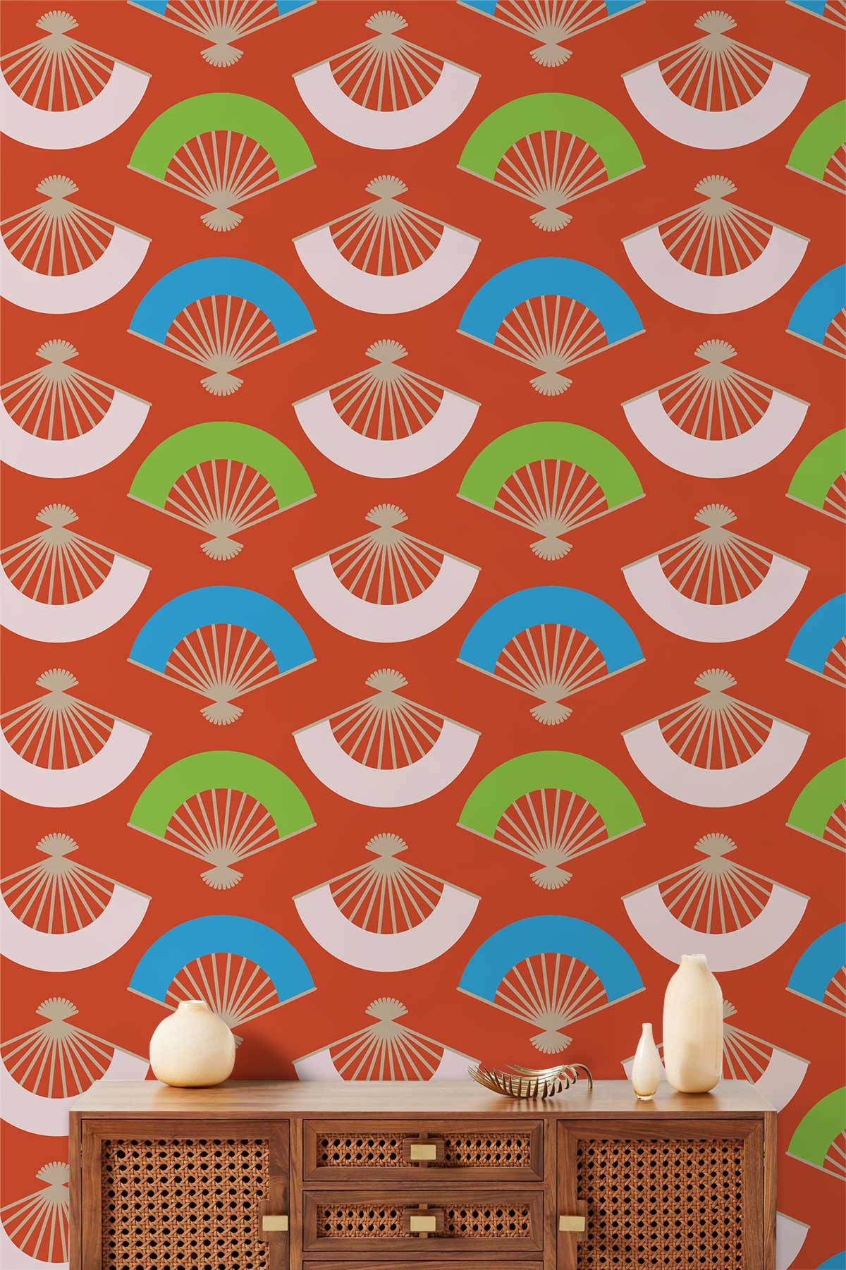This exquisite Chinese Fans Wallpaper Mural exudes sophistication, with its intricate pattern of elegantly arranged fan motifs. The rich interplay of terracotta, azure, and lime creates a warm and inviting ambience, infusing any space with a sense of timeless elegance. Perfectly suited for both traditional and contemporary settings, this mural adds depth and artistic flair to your interior decor.