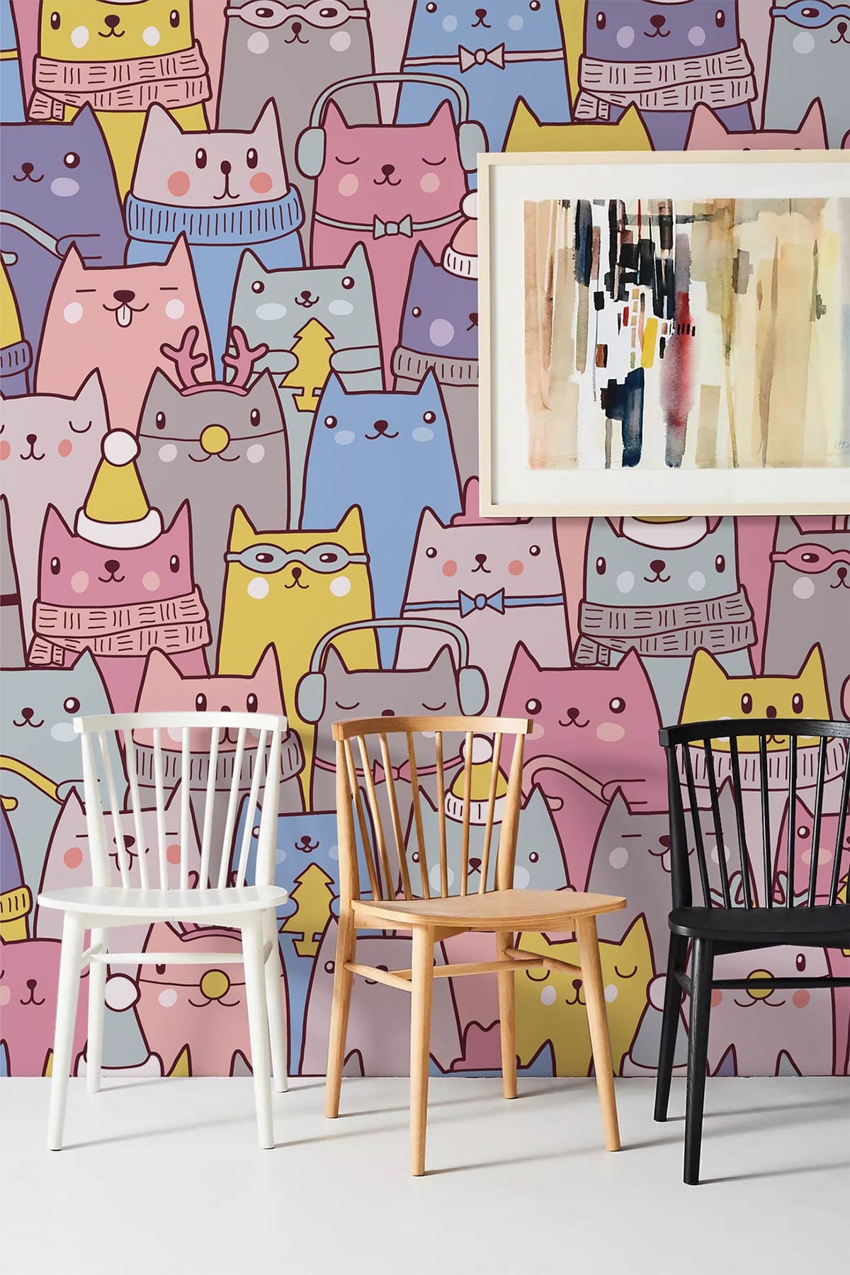 It is Christmas time, and we all decorate our homes with warm lovely Christmas decorations. Bring the joy to your kids鈥?room by this cute coloured cats鈥?Mural wallpaper. The shades of baby blue and the powder pink will make it a perfect match for a boy or a girl. These lovely cats look like a full loaded audience? your child will have the skill to know the colours of the cats and learn the objects they are wearing, and even treat them like an audience. Add a lovely spirit by having our Christmas Cats wallpaper that suits a nursery, a kid鈥檚 area or a playing room for your kids. Make it a special Christmas and surprise your kids by decorating their bedroom. Our collection is available in three different option, so you can change their bedroom by using peel and stick option for more Christmas fun & don鈥檛 miss taking pictures with the wall behind.