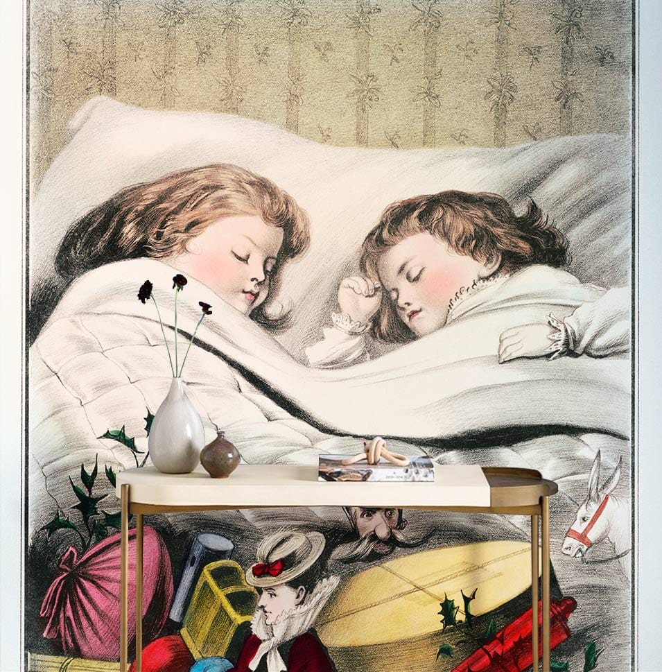 Contemplate the innocence in these little faces and enjoy the vintage artistic style with this attractive mural wallpaper for the two girls dreaming about their presents that Santa will bring up with him for them. A very unique wallpaper to style it with classic or semi modern furnishing. This mural wallpaper is a perfect classic choice for your baby born new room, or for unordinary design for your girls鈥?room before Christmas to make their little room look so special and full of happiness.