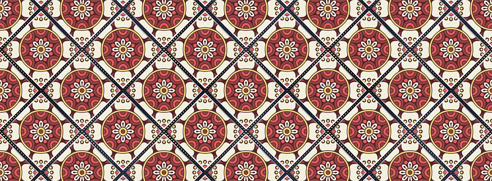 The Circle Pattern Wallpaper Mural showcases an intricate dance of symmetrical designs, where vintage motifs meet a rich tapestry of warm hues. The artwork is adorned with detailed circular elements, flawlessly interwoven with contrasting tones that exude artistic flair and elegance. Its timeless pattern seamlessly graces both contemporary and traditional settings, making it a versatile addition to any interior landscape.