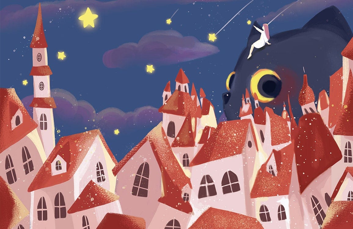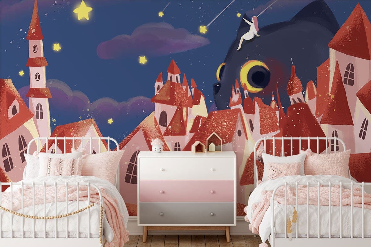 The City of Stars Wallpaper Mural encapsulates whimsical elegance with its charming depiction of a starlit cityscape. Rich with artistic flair, it showcases quaint rooftops under a dreamy night sky adorned with twinkling stars and a watchful feline gaze. This mural masterfully combines enchanting storytelling with exquisite design, offering a captivating backdrop suitable for any discerning space.