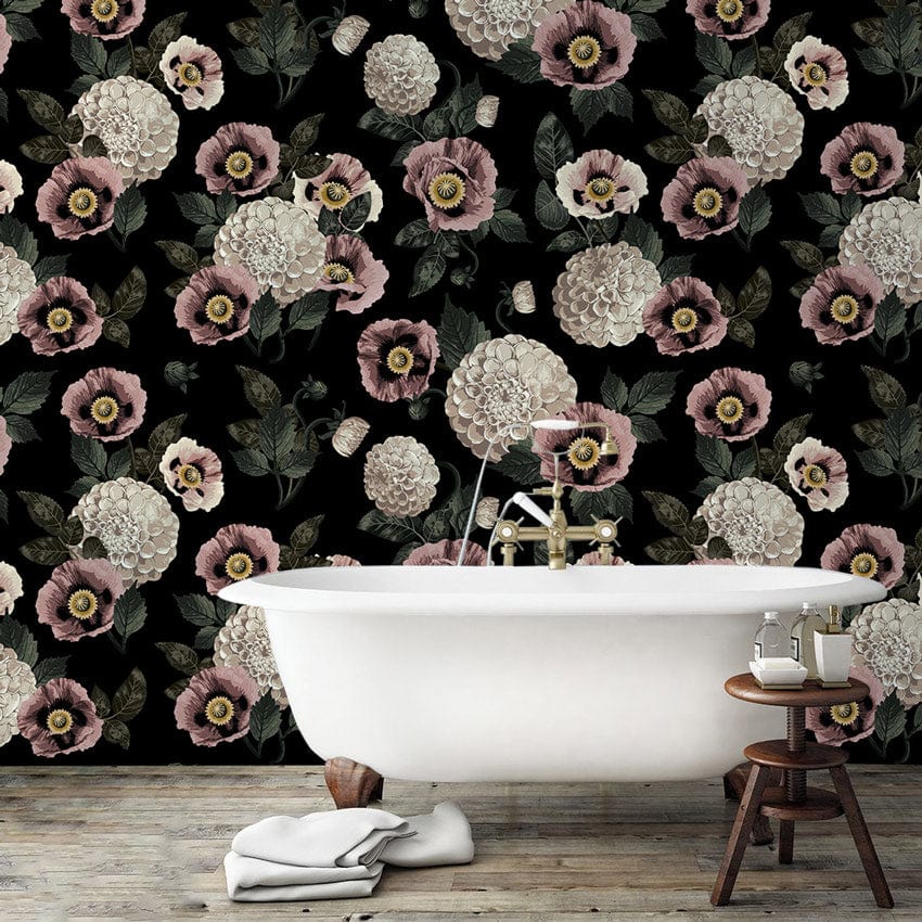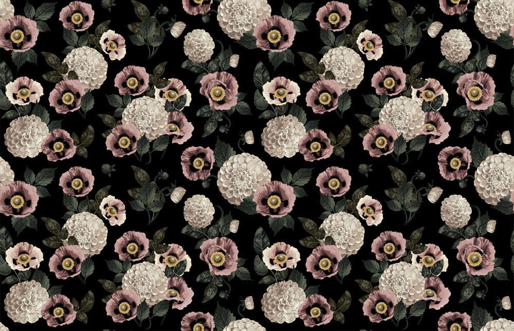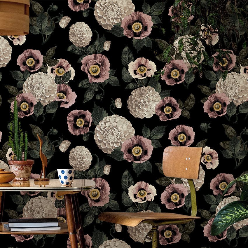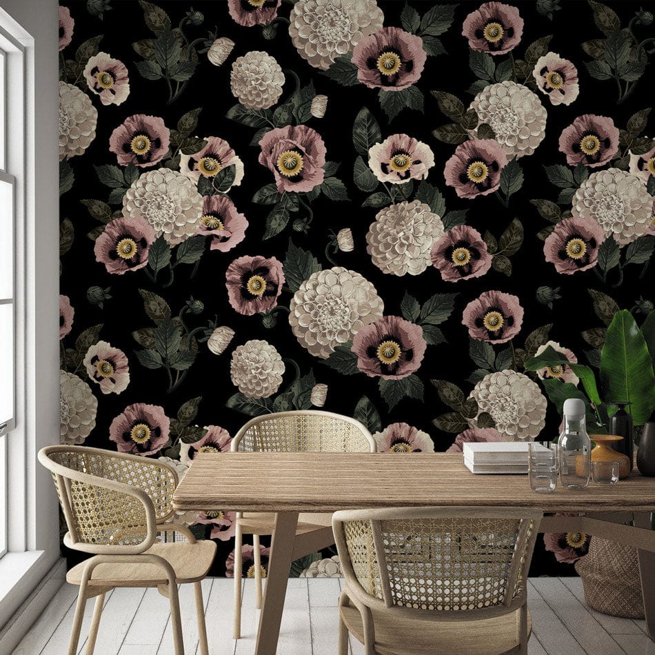 The Classic Blossom Elegance Mural Wallpaper exudes sophistication through its exquisite floral design. Featuring delicate hydrangeas and poppies, this mural captures the timeless beauty of nature against a deep background. The intricate detailing and soft, romantic hues create a sense of artistic luxury, ideal for elevating any space with its refined charm.