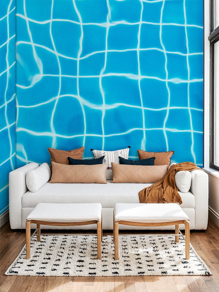 Immerse yourself in the serene beauty of this Clear Swimming Pool wallpaper mural. Its vivid interplay of vibrant blues and soft white lines creates a tranquil yet invigorating atmosphere, evocative of sunlit waters gently kissed by summer winds. This mural's luminous effect invites a sense of spaciousness, making it an exquisite choice for interiors seeking a splash of contemporary elegance and timeless charm.