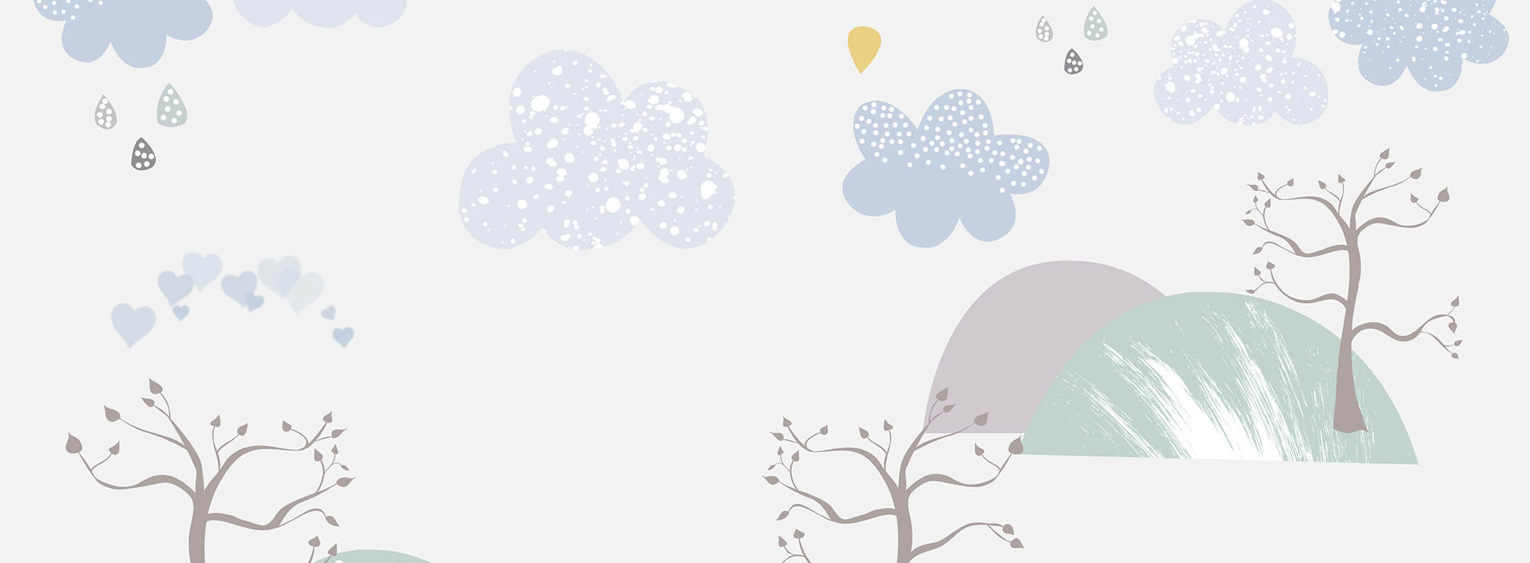 This kids隆炉, pastel- coloured, clouds, trees wallpaper mural utilizes soothing tones of children隆炉s favorite colours, such as greens, purples and blues. Drift away into the calmness of the mind with these floating clouds and some patterned with raindrops to moisten the trees on hills. It隆炉s suitable for a bedroom, play area, or nursery.