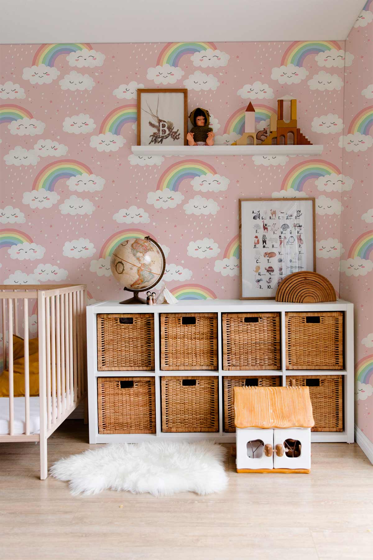 Crafted to inspire joy and wonder, the Clouds & Rainbow Wallpaper Mural showcases a whimsical dance of fluffy clouds and vibrant rainbows against a soft pink backdrop. This enchanting design brings a playful yet sophisticated touch to any room, enveloping spaces with a sense of timeless charm. The intricate details of each cloud and rainbow offer a dynamic visual texture, making it a delightful addition to both modern and classic interiors.