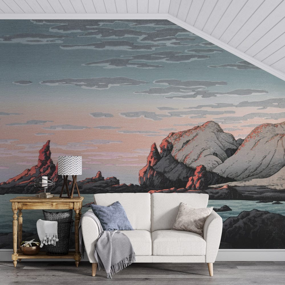 This Coastal Rock Sunset Mural Wallpaper exquisitely captures the serene beauty of a sunset over rocky shores. Delicate hues of dusk mingle with bold rock formations, offering an artistic masterpiece that suits diverse interiors. The design blends natural splendour with intricate textures, perfect for creating a focal point that embodies sophistication and timeless elegance.