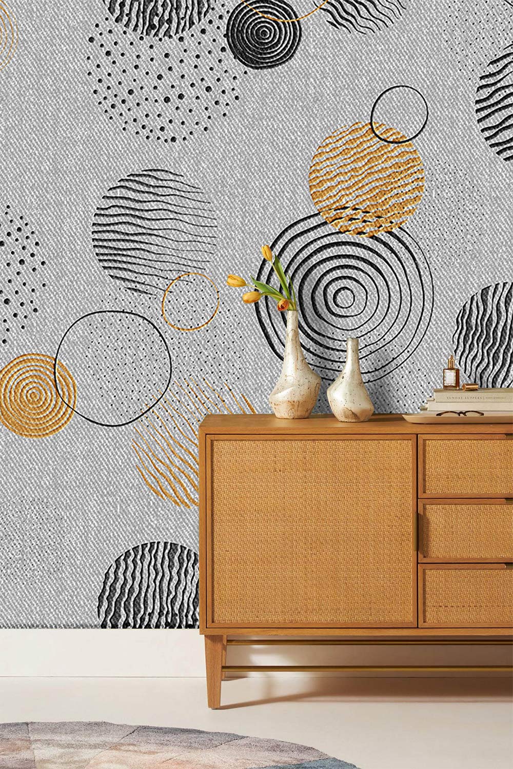 The Coils Wallpaper Mural artfully combines interwoven circular patterns with intricate linework, presenting an enchanting tapestry of motion and stillness. The sophisticated blend of monochrome tones accented with soft gold creates a refined harmony, perfect for any setting that values elegance and character. Ideal for bringing a touch of artistic flair into spaces, this mural complements both contemporary and classic interior designs, providing a unique visual rhythm that captivates and delights.