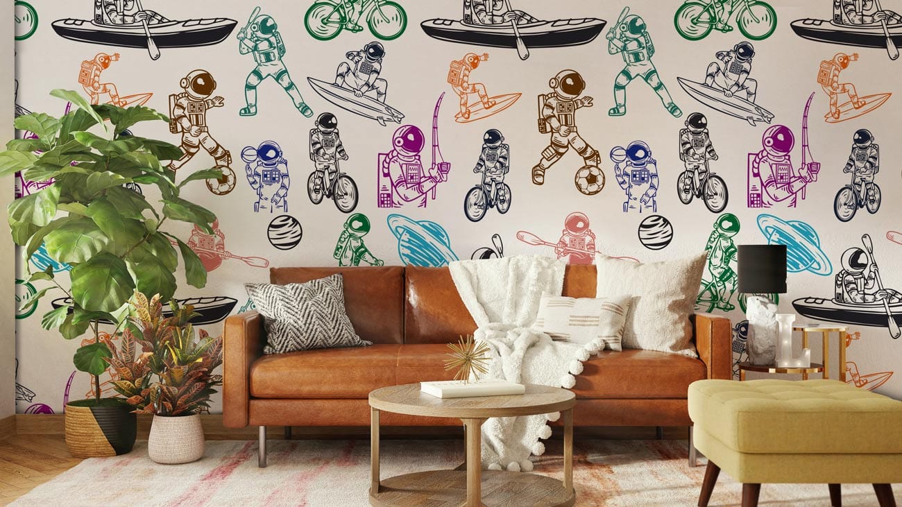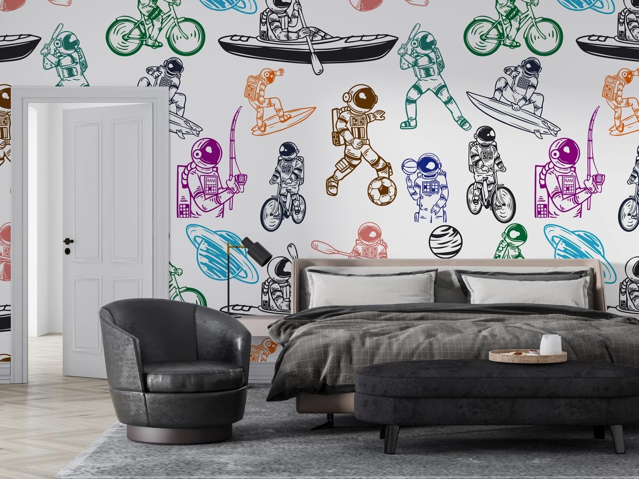 This Colorful Astronaut Wallpaper Mural will look great in any children's bedroom or playroom. With its multiple scenes of astronauts in various activities, it is sure to perk up your little one's room. With this nice decor and decorative idea, you can choose the image of your favorite space explorer over the moon that you want to include in the design. This wallpaper will give your kids a sense of a journey into the unknown, and the bright design will bring an interesting twist to any interior.