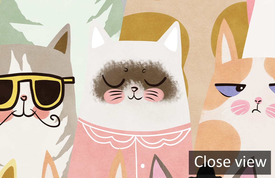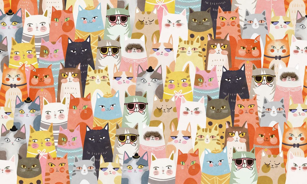 Delight in the playful elegance of the Colourful Distinctive Cats Wallpaper Mural, where an array of charming feline characters, each with unique expressions and accessories, create a tapestry of sophistication and whimsy. The meticulous brushstrokes and rich textures emit a sense of warmth and allure, making it an ideal choice for spaces craving an artistic flair. Its lively interplay of colours and thoughtfully designed motifs provide a timeless appeal, perfect for adding character to any setting.