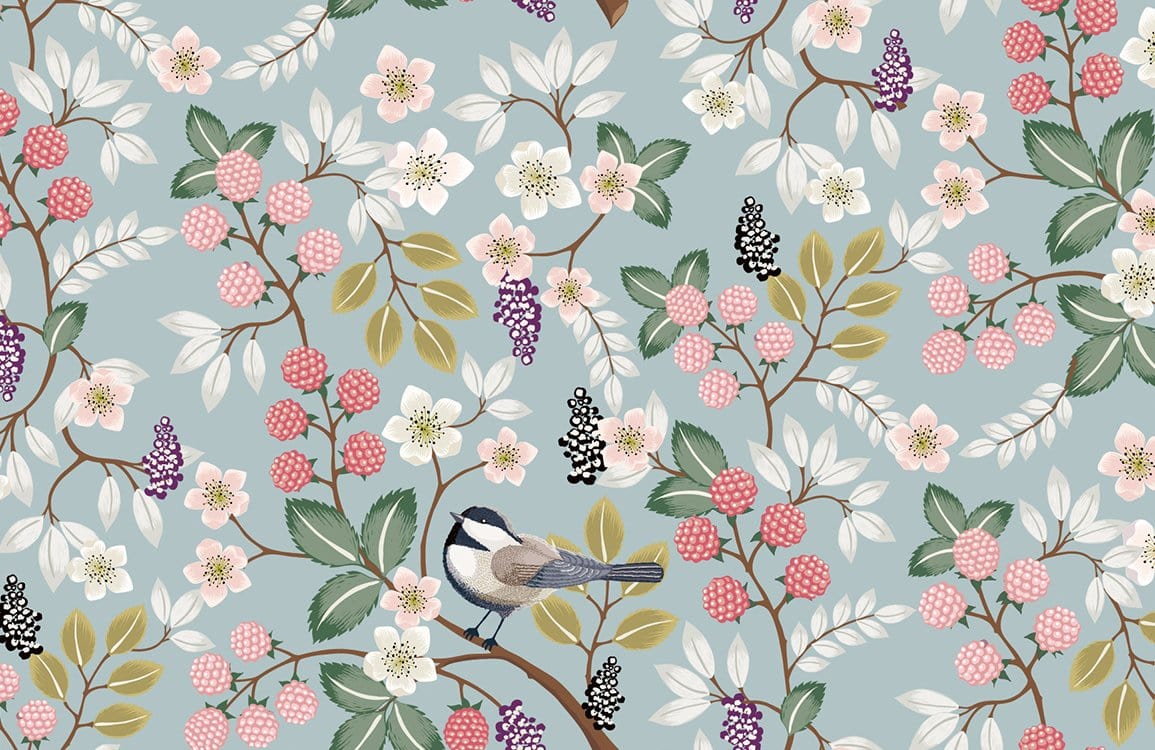 This exquisite wallpaper mural features a serene avian theme set amidst a tapestry of delicate blossoms and berries, exuding an elegant simplicity. The gentle blue backdrop enhances the intricately detailed foliage and the subtle play of colours, offering a timeless elegance that gracefully uplifts any interior. Ideal for adding a touch of natural beauty to various spaces, its artistic design speaks to both classic and contemporary sensibilities.