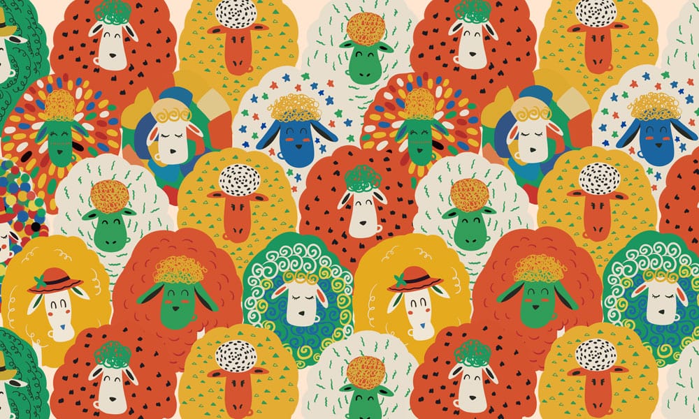 Immerse yourself in a whimsical tapestry with the Colorful Lambs Wallpaper Mural. Each sheep is adorned with vibrant patterns, showcasing an eclectic mix of artistic expression. The detailed textures and lively hues of orange, green, and blue create an inviting backdrop, effortlessly complementing both classic and contemporary settings. This mural exudes a playful charm, making it a delightful choice for an array of interior spaces.