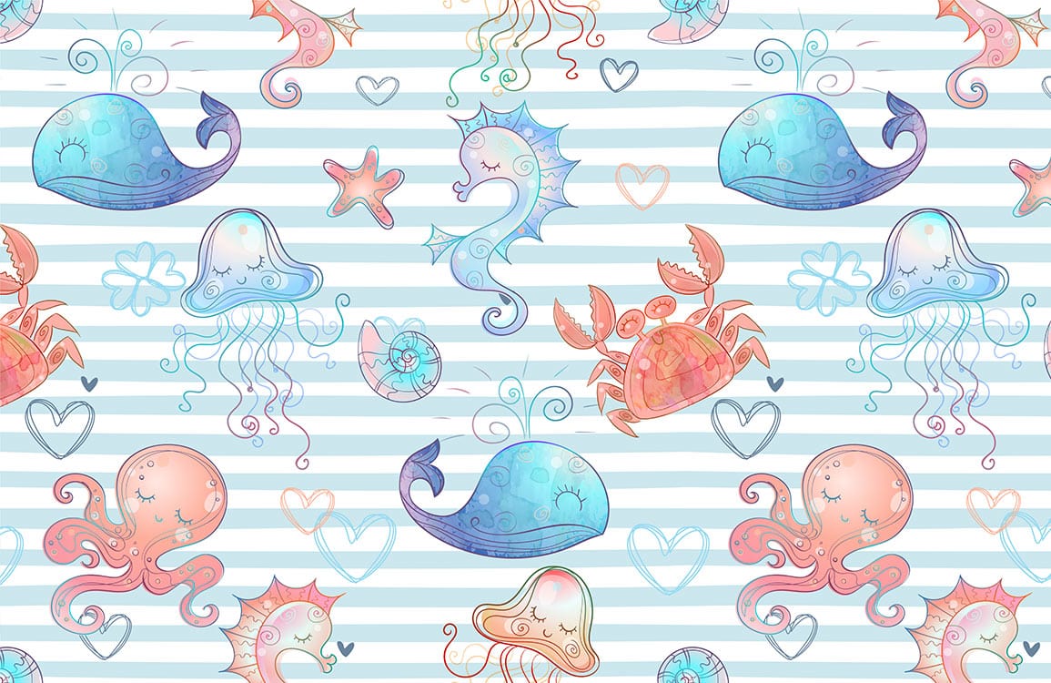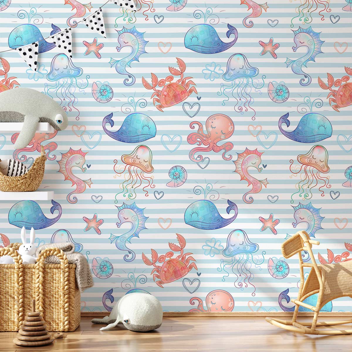 With this Ocean Party Mural Wallpaper, you can bring the beach inside. An adorable pattern of octopus, whale, crab, jellyfish, seahorse, and starfish lives among the baby blue striped ocean background in this thrilling mural. This fish wallpaper will add a dash of colour and joy to any of your child's room. This charming mural featuring a nautical theme and blue stripes design can also get the whole family excited for summer vacation.