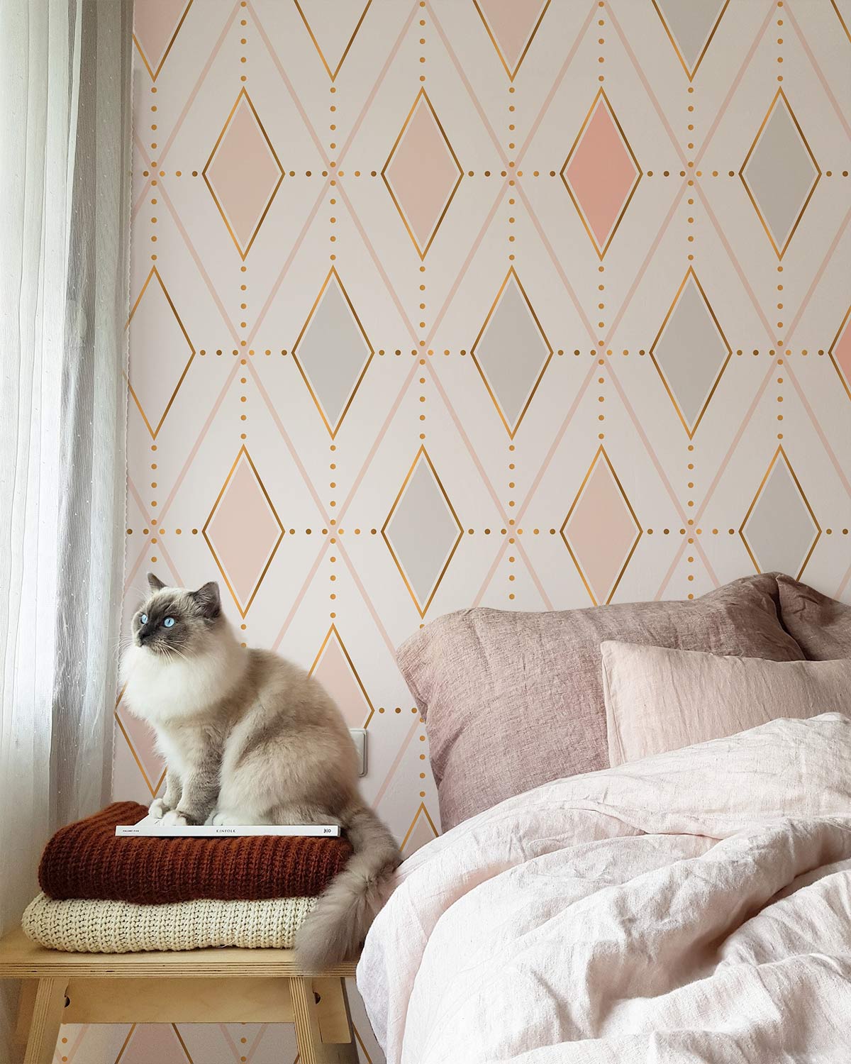 Elevate your interiors with the Colourful Rhombuses Wallpaper Mural, where geometric precision meets delicate artistry. This mural features a rhythmic arrangement of pastel rhombuses, outlined with fine gold accents, creating an exquisite tapestry that draws the eye and enriches the room. Its soft, muted colour palette balances modern flair with timeless elegance, making it an ideal choice for those seeking to imbue their spaces with subtle sophistication.