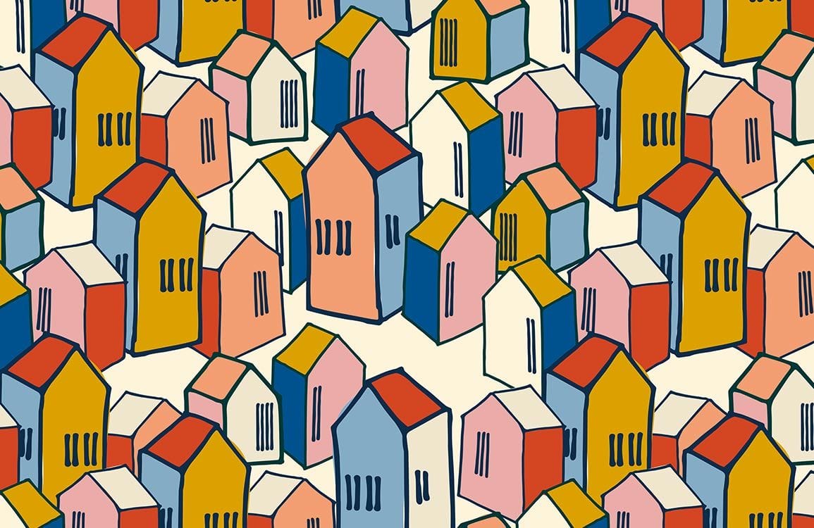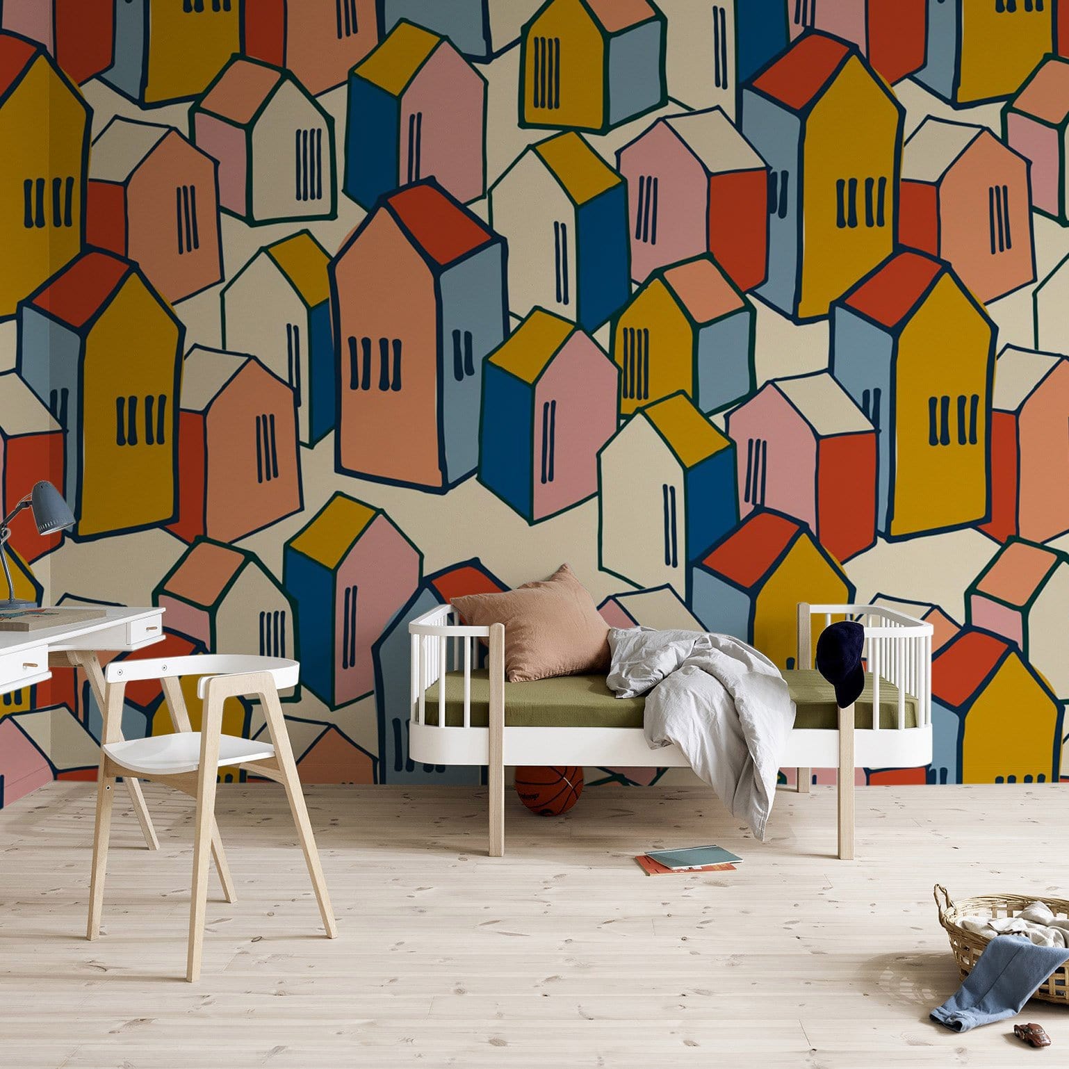 Infuse your space with a sophisticated charm using the Coloured House Wallpaper Mural. This design features an abstract arrangement of geometric houses in warm, autumnal tones. Its artistic symmetry and playful palette create a dynamic yet calming ambience, making it a versatile choice for various interiors.