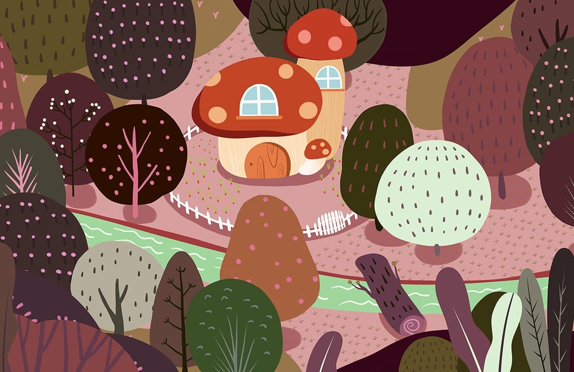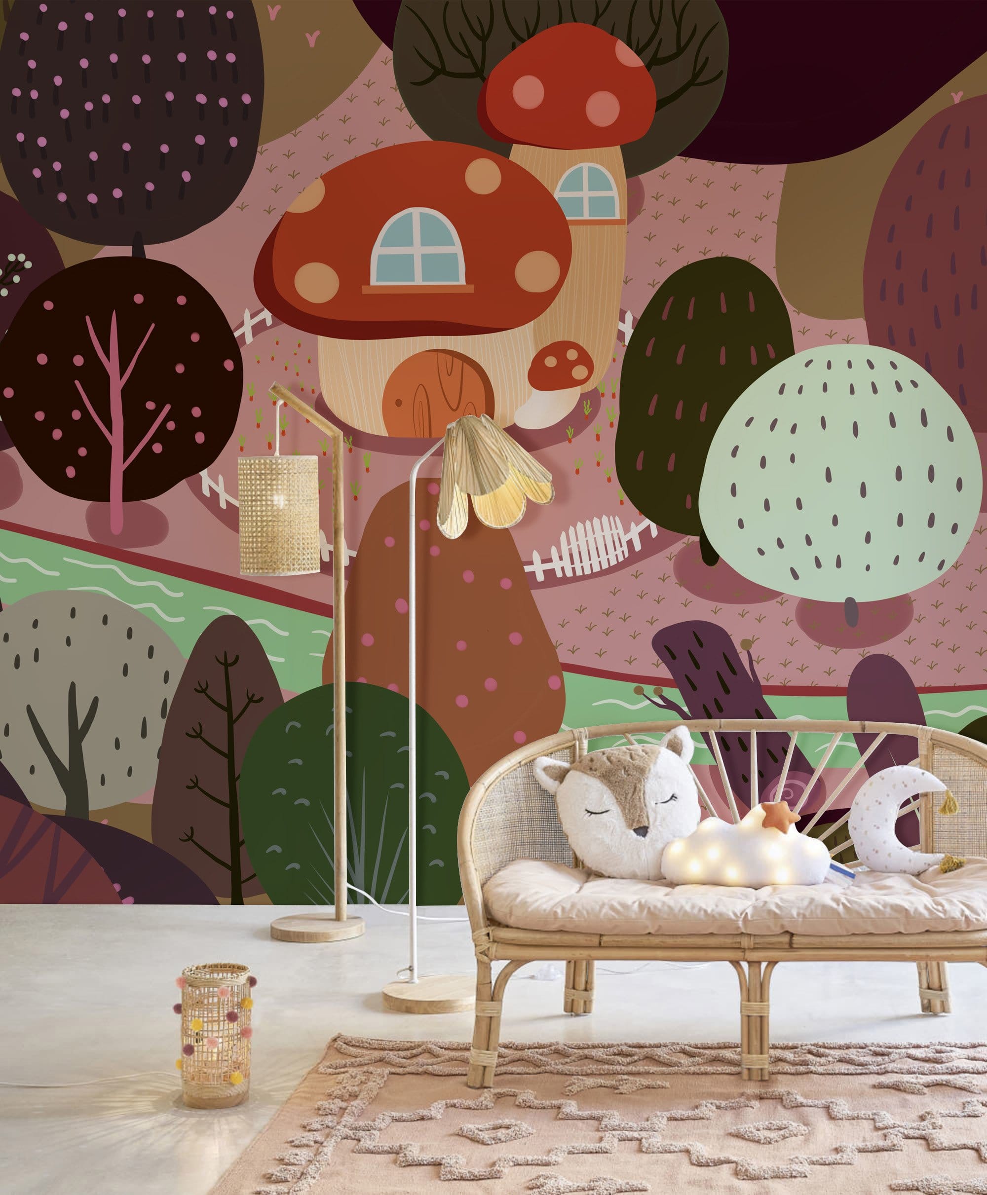 Immerse your space in enchanting whimsy with the Cartoon Trees II Wallpaper Mural. This design features charming toadstool houses nestled amidst a dreamy forest landscape, rich with playful shapes and textures. The mural's artistic detail and subdued colour palette lend an air of sophistication, seamlessly fitting into a variety of interiors while evoking a sense of timeless wonder.