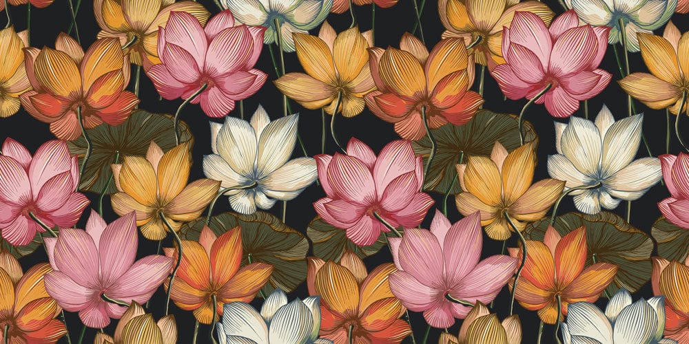 Immerse yourself in the captivating elegance of the Colourful Lotus Wallpaper Mural, where intricate lotus petals in soft pinks, warm yellows, and crisp whites unfold against a deep backdrop. Each flower is masterfully detailed, inviting a sense of serenity and natural grace into your interiors. Ideal for an array of spaces, this mural evokes a timeless charm that complements both contemporary and classic décor.