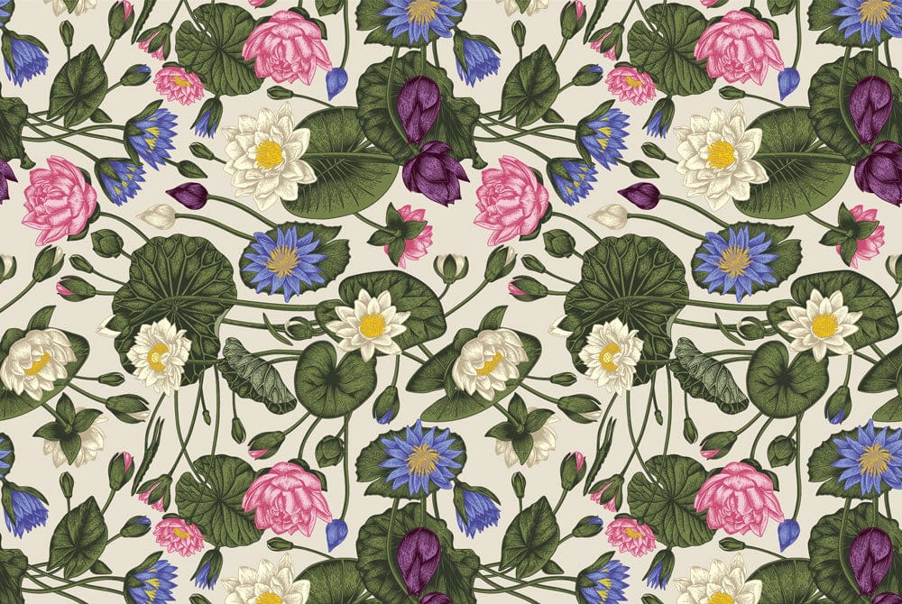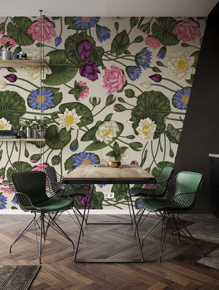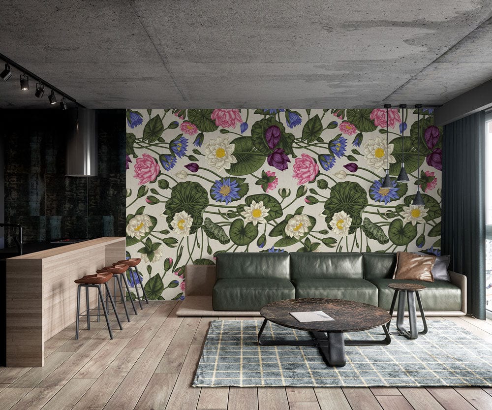 The Colourful Vibrant Lotus Wallpaper Mural captures the elegance of blooming lotus flowers, rendered in a symphony of delicate hues. Its intricate floral design is detailed with lush greens, soft pinks, and deep purples, creating an enchanting visual tapestry. This mural adds a sophisticated charm to interiors, effortlessly enhancing living rooms, bedrooms, or offices with its timeless appeal.