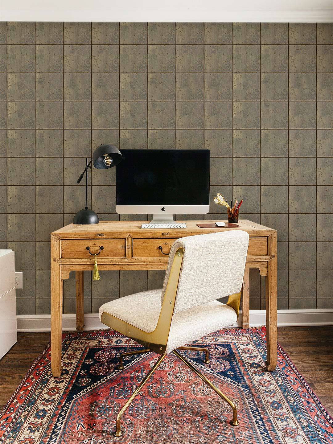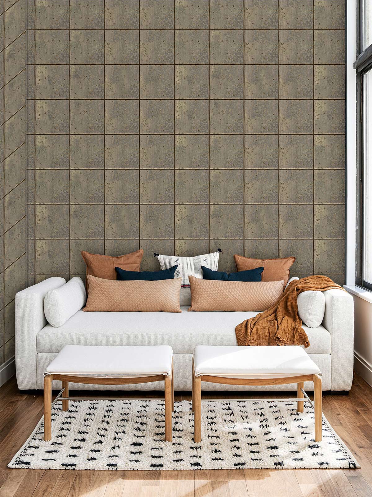 The Corten Wallpaper Mural exudes a sophisticated charm with its intricate grid pattern, evoking a sense of industrial elegance. Its nuanced texture and earthy tones of rust and taupe create a warm, inviting ambiance, making it an ideal choice for diverse interior settings. This mural captures the allure of weathered corten steel, adding depth and character to any room.