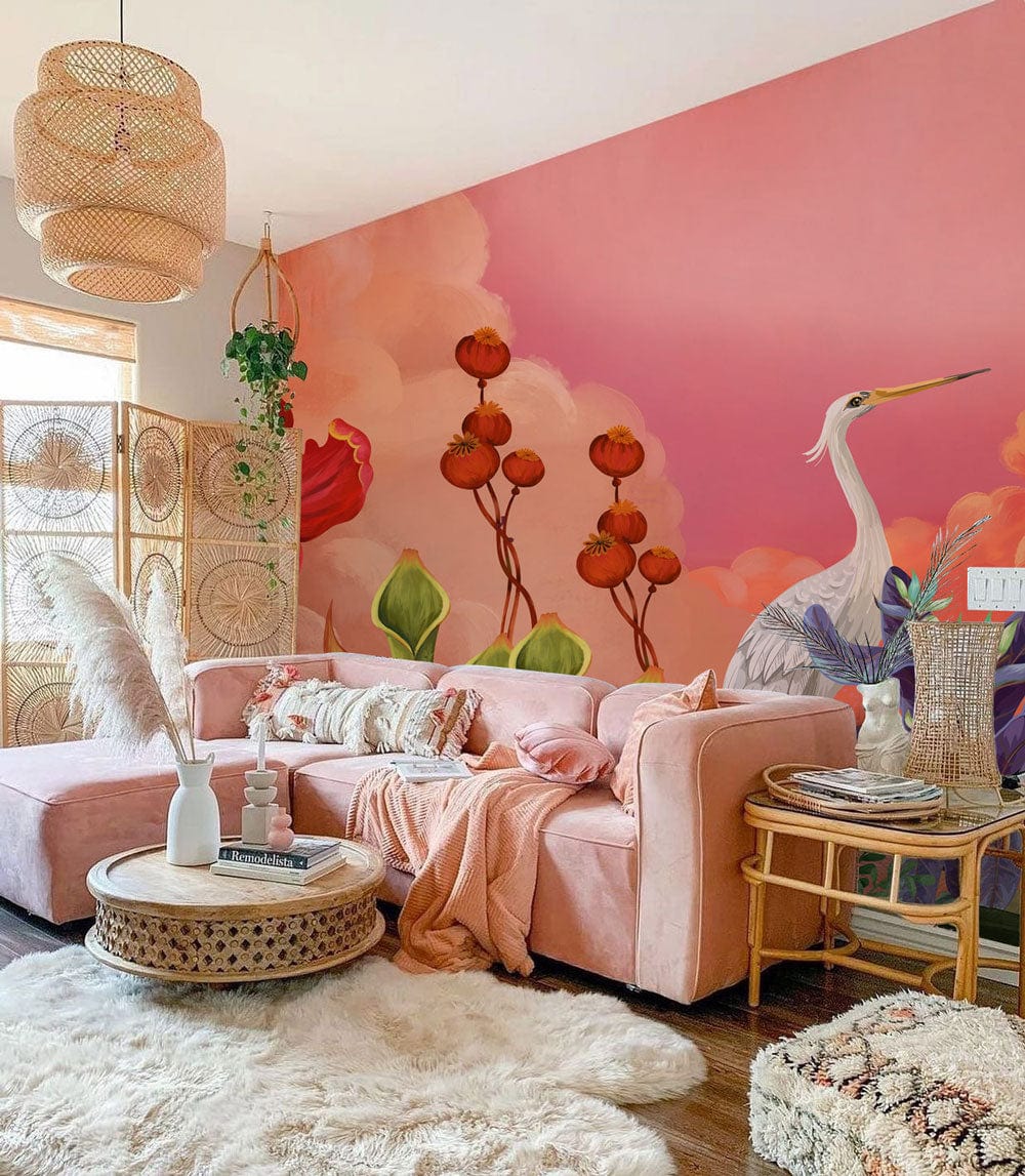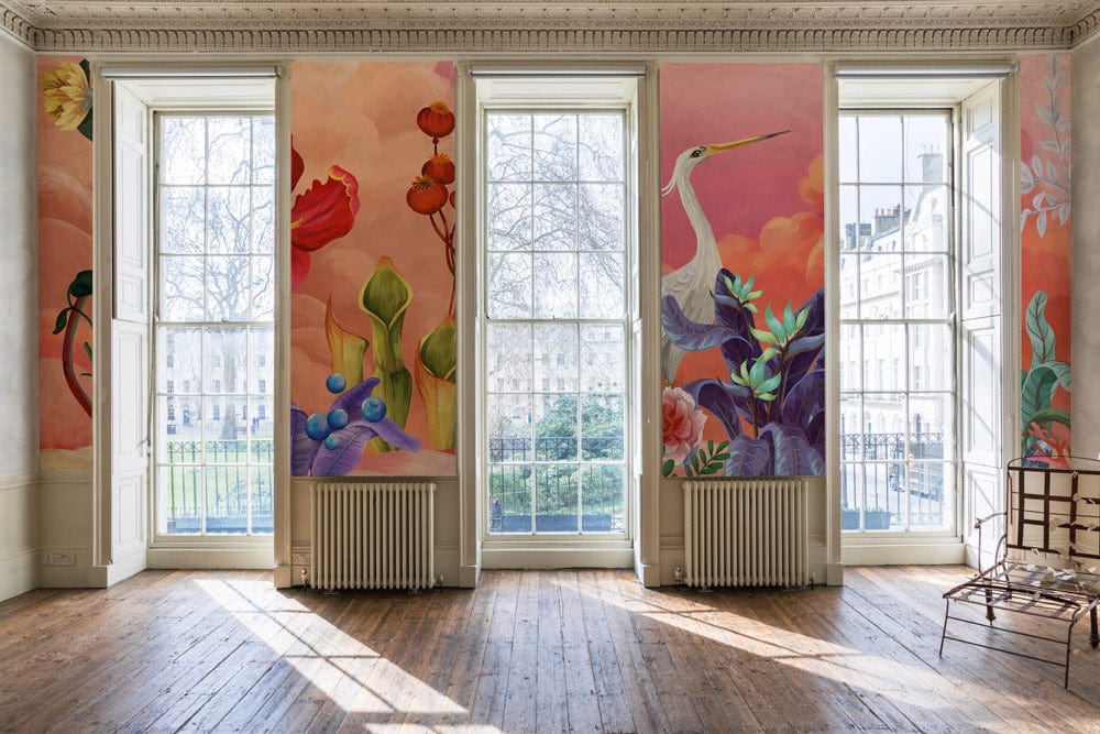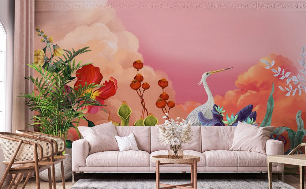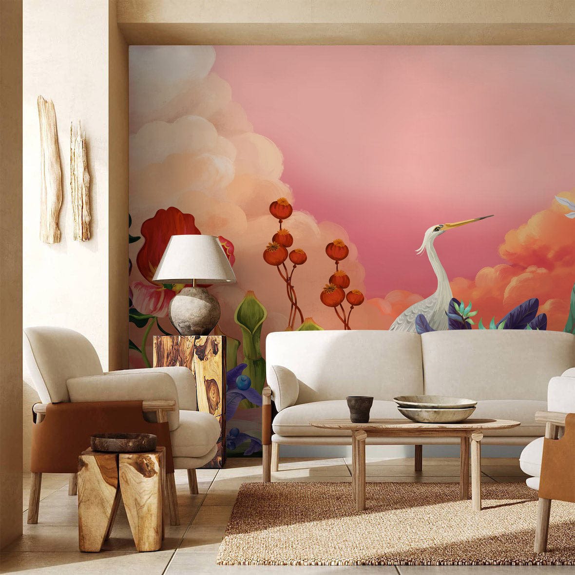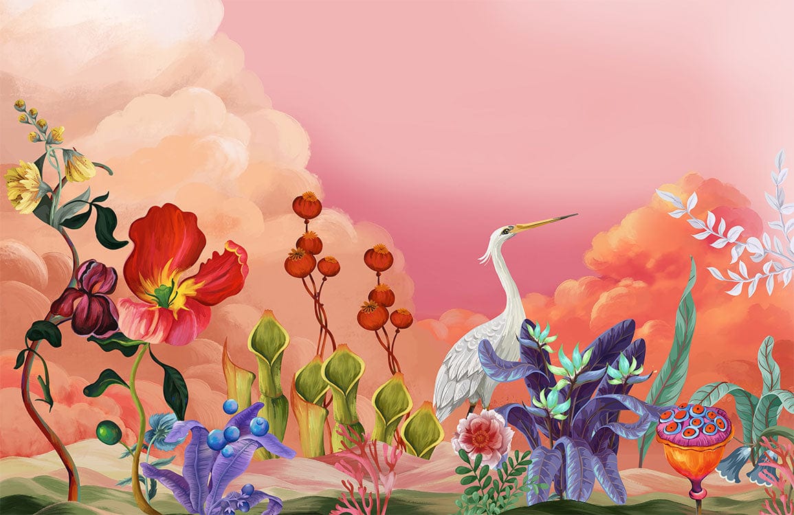 Give your room a touch of the outdoors and create a look that's uniquely yours. Our Crane in Garden Wallpaper Mural features a beautiful depiction of an idyllic and colourful garden with a large playful crane that will look fantastic in any home decor. With a charmingly illustrated crane surrounded by big vibrant flowers, it's sure to be a stunning focal point for your home or office. This mural will surely give your space a shot of pop art pizzazz that you can be proud of.