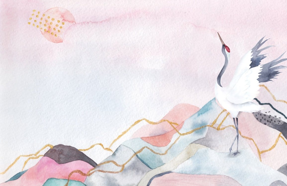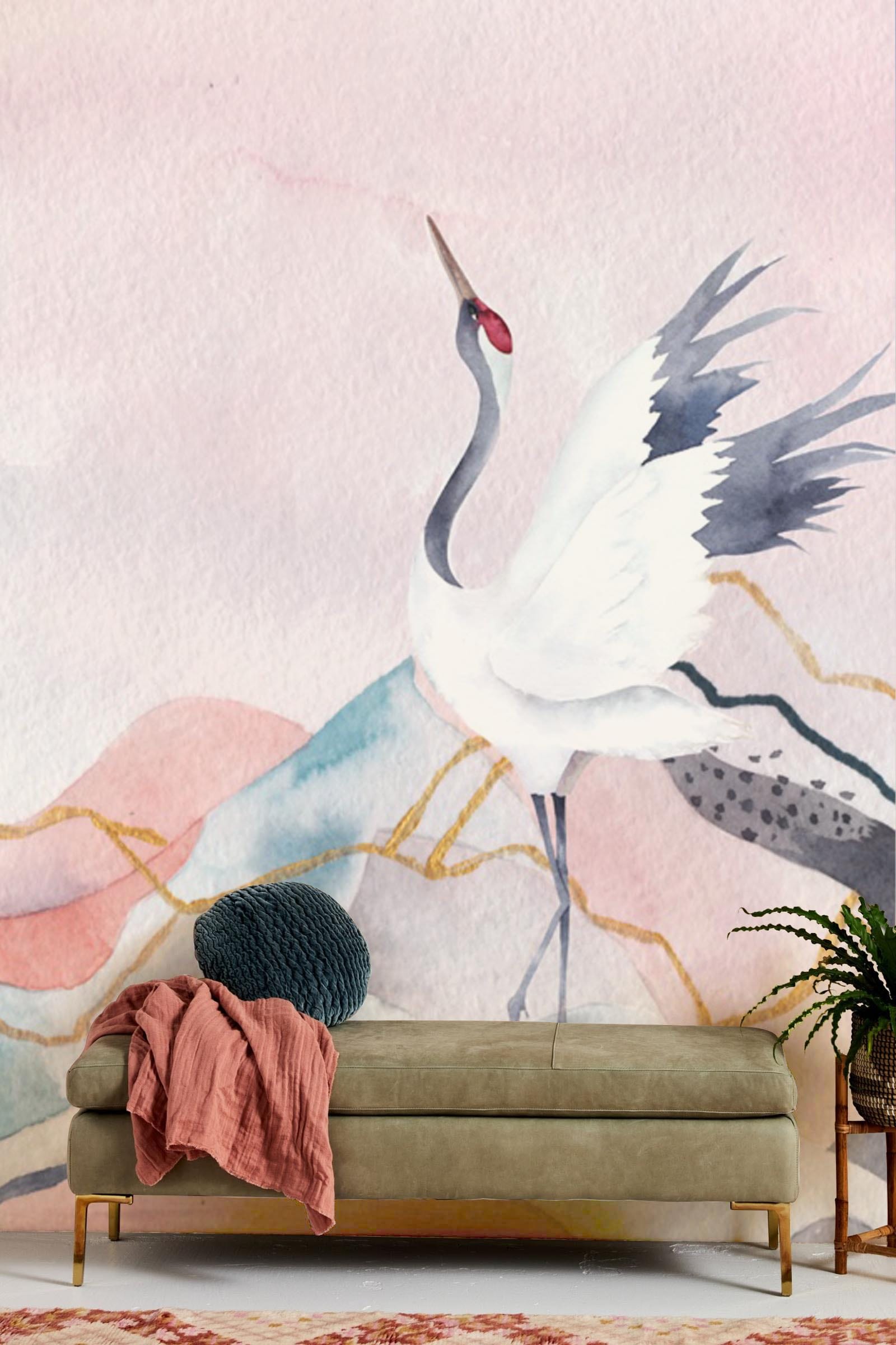 This pink dreamy crane wallpaper mural is created with hand-drawn water colour technique.This beautiful, amazing painting of a stunning and elegant crane standing on the top of a mountain ready to fly, will be perfect wall mural for your home. Interesting rendering with a natural atmosphere and a refreshing wall decoration.