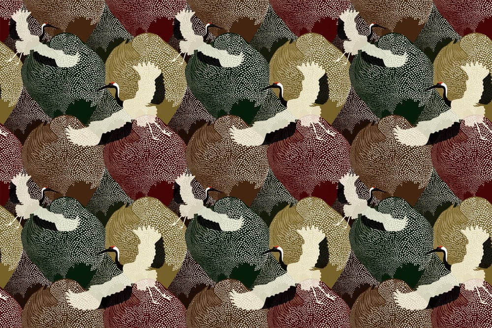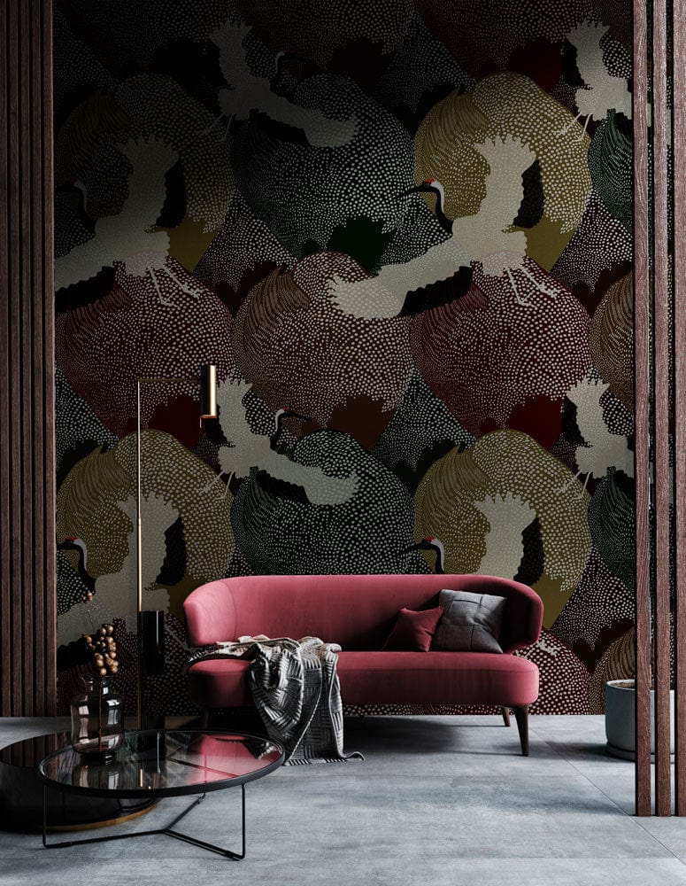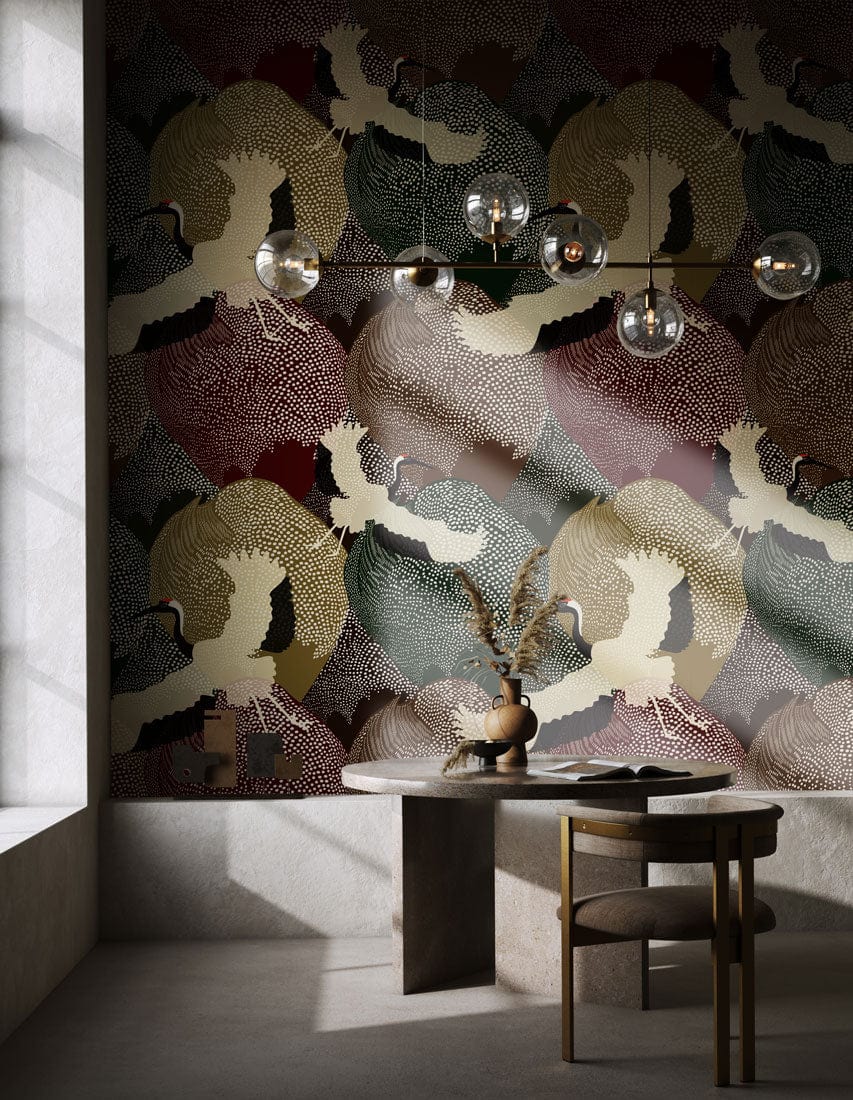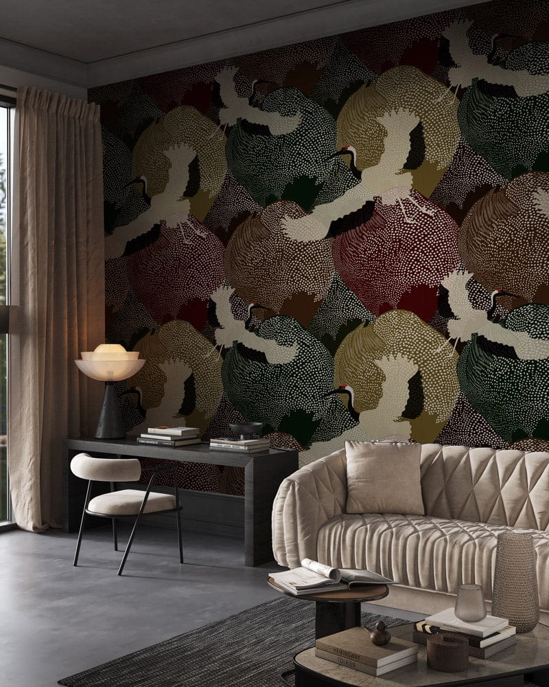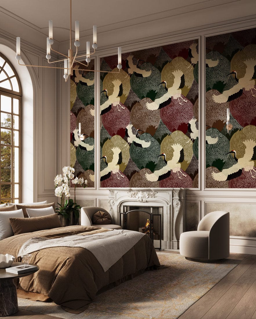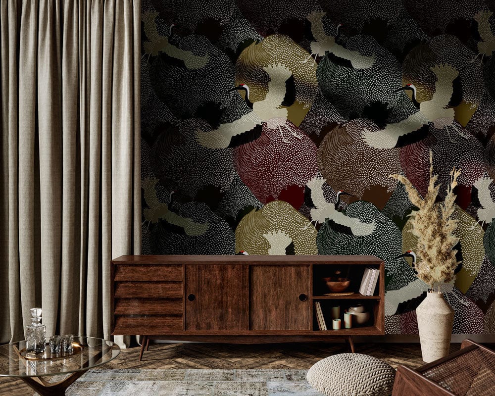 Inspired by serene landscapes, the Cranes Over Peaks mural wallpaper elegantly captures the grace of cranes amidst rolling hills. The intricate detailing portrays a harmonious dance of nature, infusing sophistication and a timeless appeal into any setting. With a refined palette and exquisite textures, it seamlessly complements classic and contemporary interiors, adding warmth and character to your space.