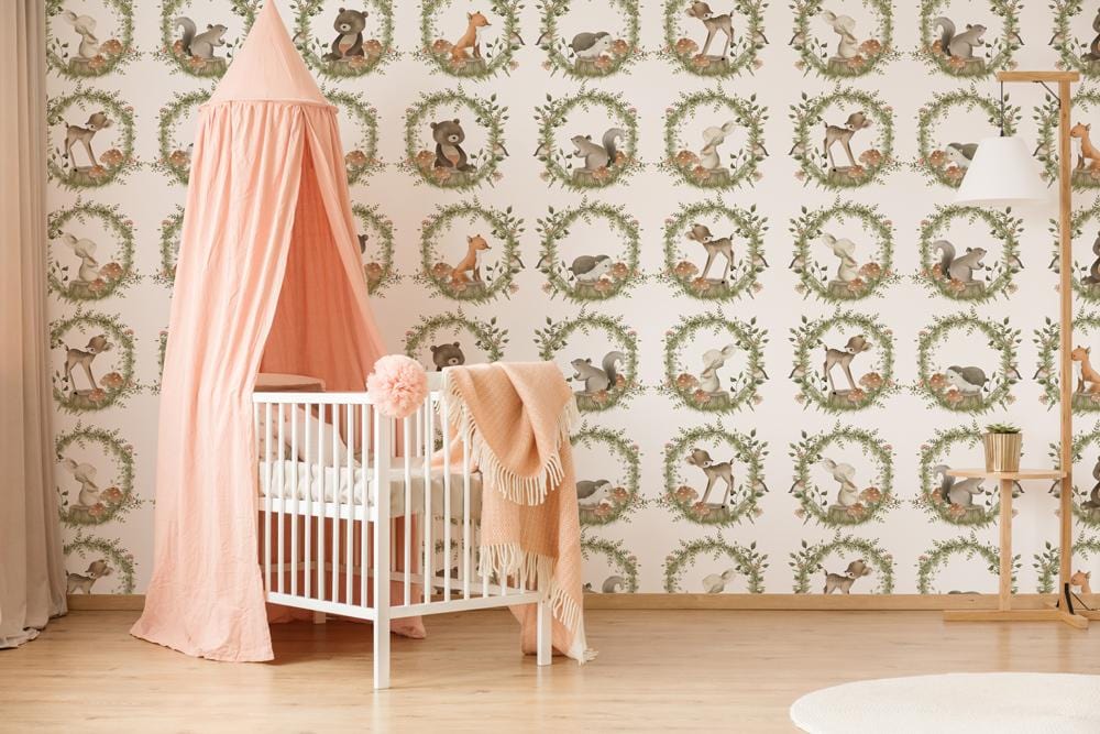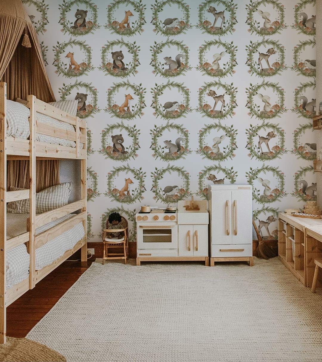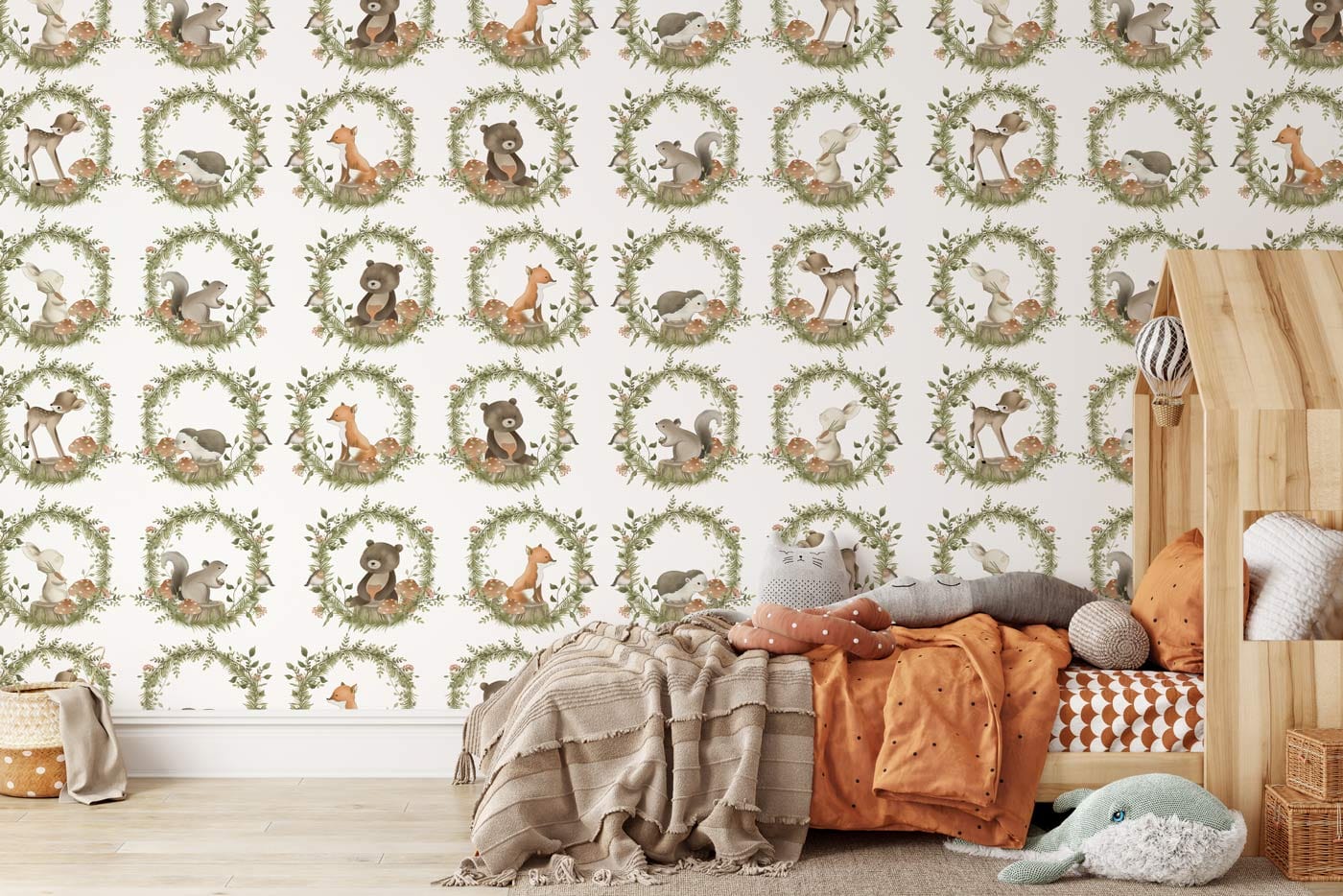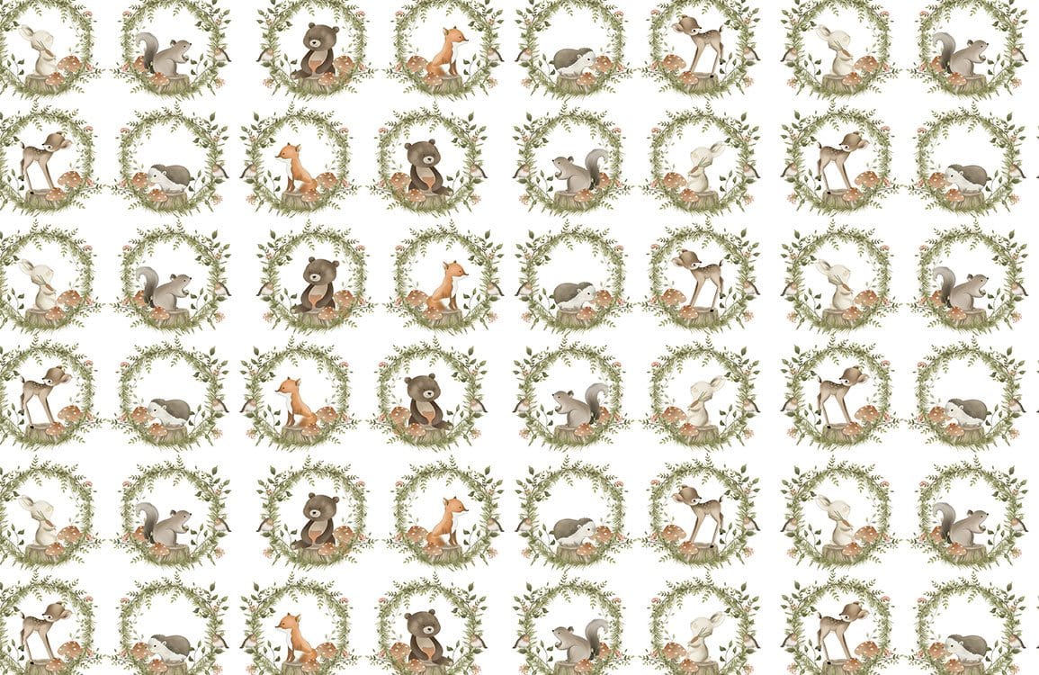 Infuse your space with whimsical charm using this Cute Animals Wallpaper Mural. Each panel showcases delicately illustrated woodland creatures framed by elegant foliage wreaths. The mural's soft, earthy tones impart a serene and timeless allure, melding effortlessly into both traditional and contemporary interiors. Ideal for cultivating a tranquil ambience, this refined design is a captivating choice for any discerning home decorator.