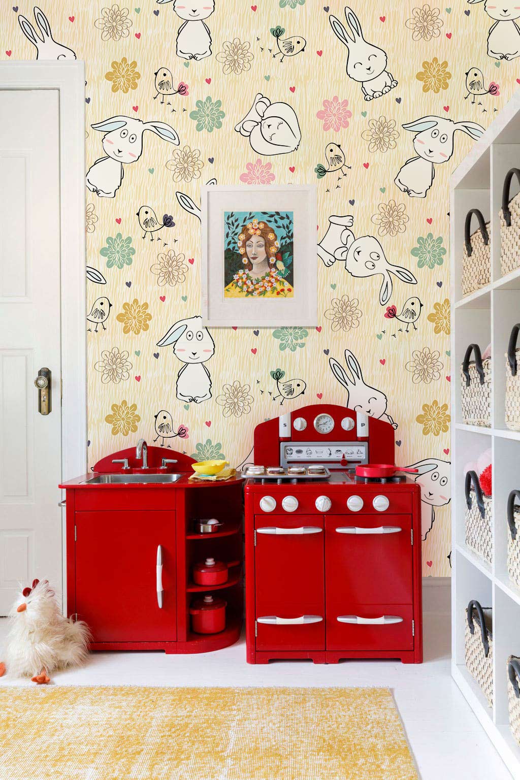 These cute little bunnies will make your girl feels her room so adorable and will love it. Give her a new gift and renovate her small area with a very special mural wallpaper design that will give a cute looking to the room and will make it so chic and full of positivity. The powder pink shade at the back ground is so light and will make you feel the room bigger and brighter. Style the wallpaper with light decorations and keep these happy birds and bunnies spreading happiness and love all over the room.